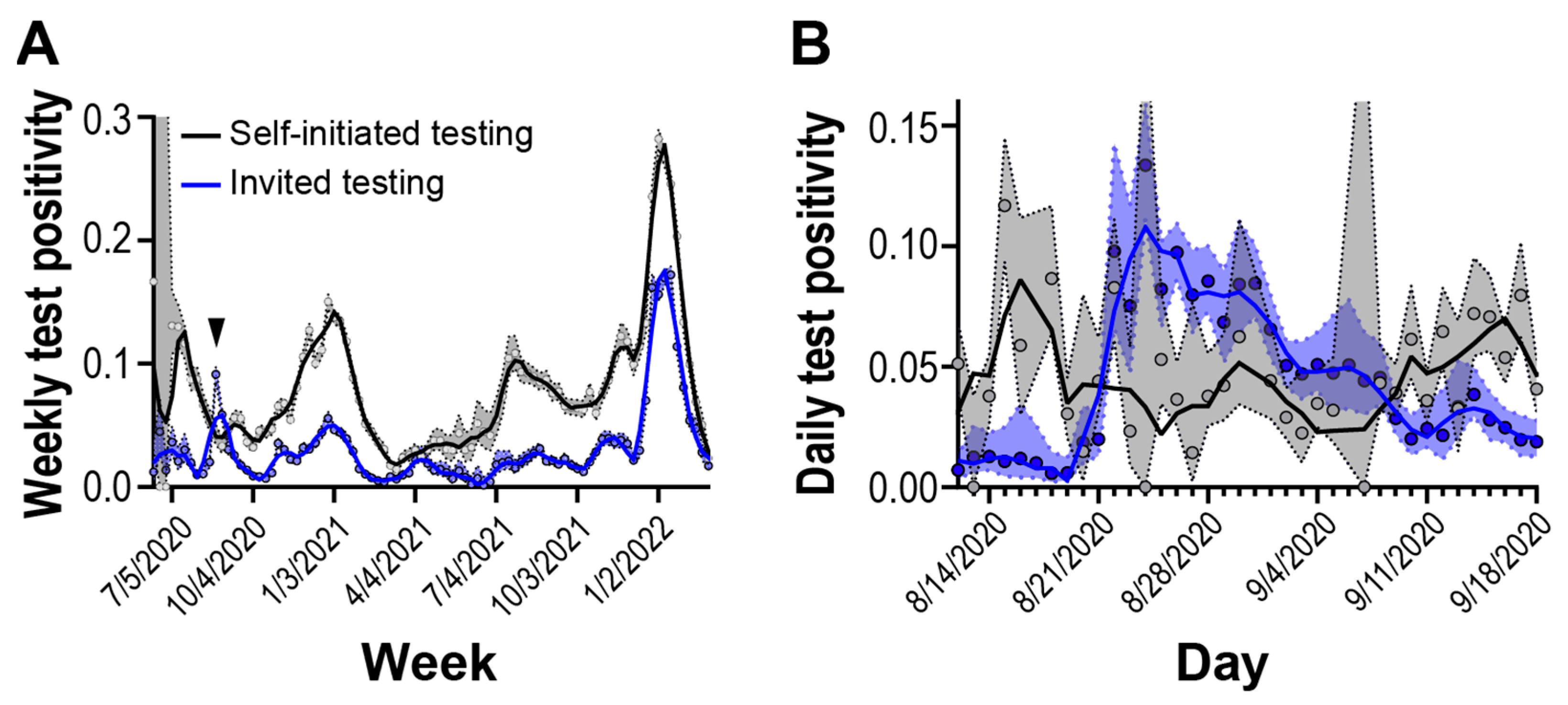 Figure 3. Test positivity rate of self-initiated and invited testing cohorts. Solid lines are 2nd order smoothing functions across 3 neighbor data points. Blue and gray shaded regions reflect 95% confidence intervals. (A) Weekly test positivity during the surveillance period. Arrow shows outbreak period. (B) Daily test positivity around outbreak period.