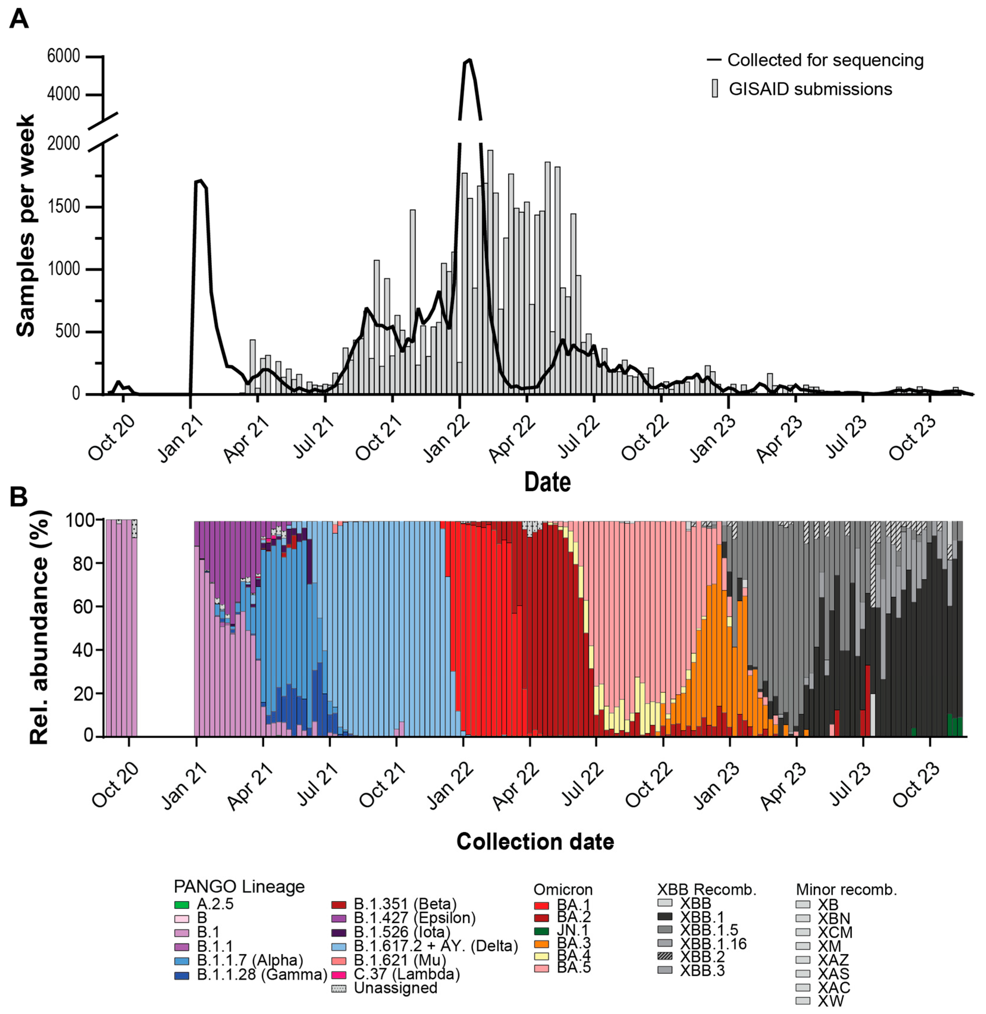 Figure 4. Whole viral genome sequencing of SARS-CoV-2 positive saliva samples. (A) Weekly RT-PCR positive samples (line) and weekly GISAID submissions (bars). (B) Relative weekly abundance of SARS-CoV-2 PANGO lineages. WHO VOC names in parentheses.