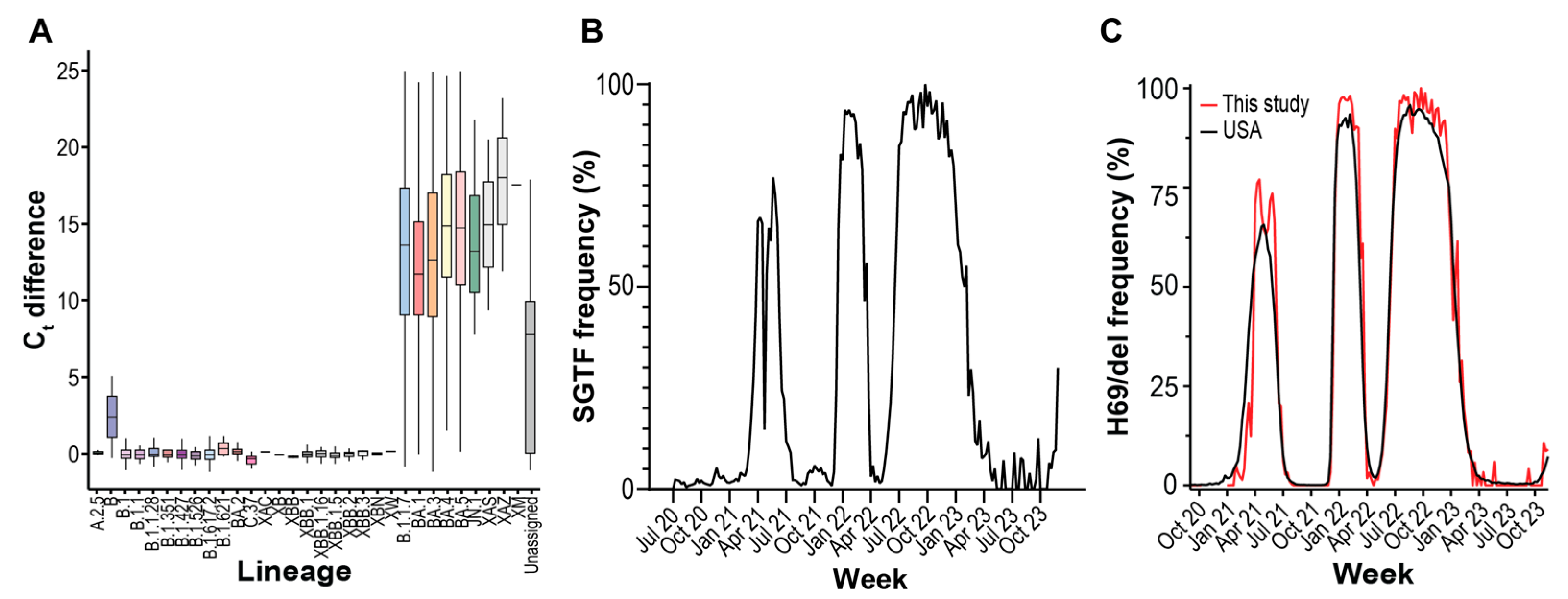 Figure 5. S gene target failure (SGTF) on TaqPath COVID-19 Combo Kit RT-PCR assays. (A) Difference between S gene and mean ORF1ab/N gene Ct values for PANGO variants displaying SGTF. The bottom, middle, and top of the boxes correspond to Q1, Q2, and Q3, respectively. Box whiskers correspond to the largest value no further than 1.5× IQR. (B) Weekly SGTF prevalence in local samples. SGTF is the S gene and mean ORF1ab/N gene Ct values differing by 3 or more. (C) Weekly abundance of samples in the GISAID database containing S:H69del mutation in USA and local samples.