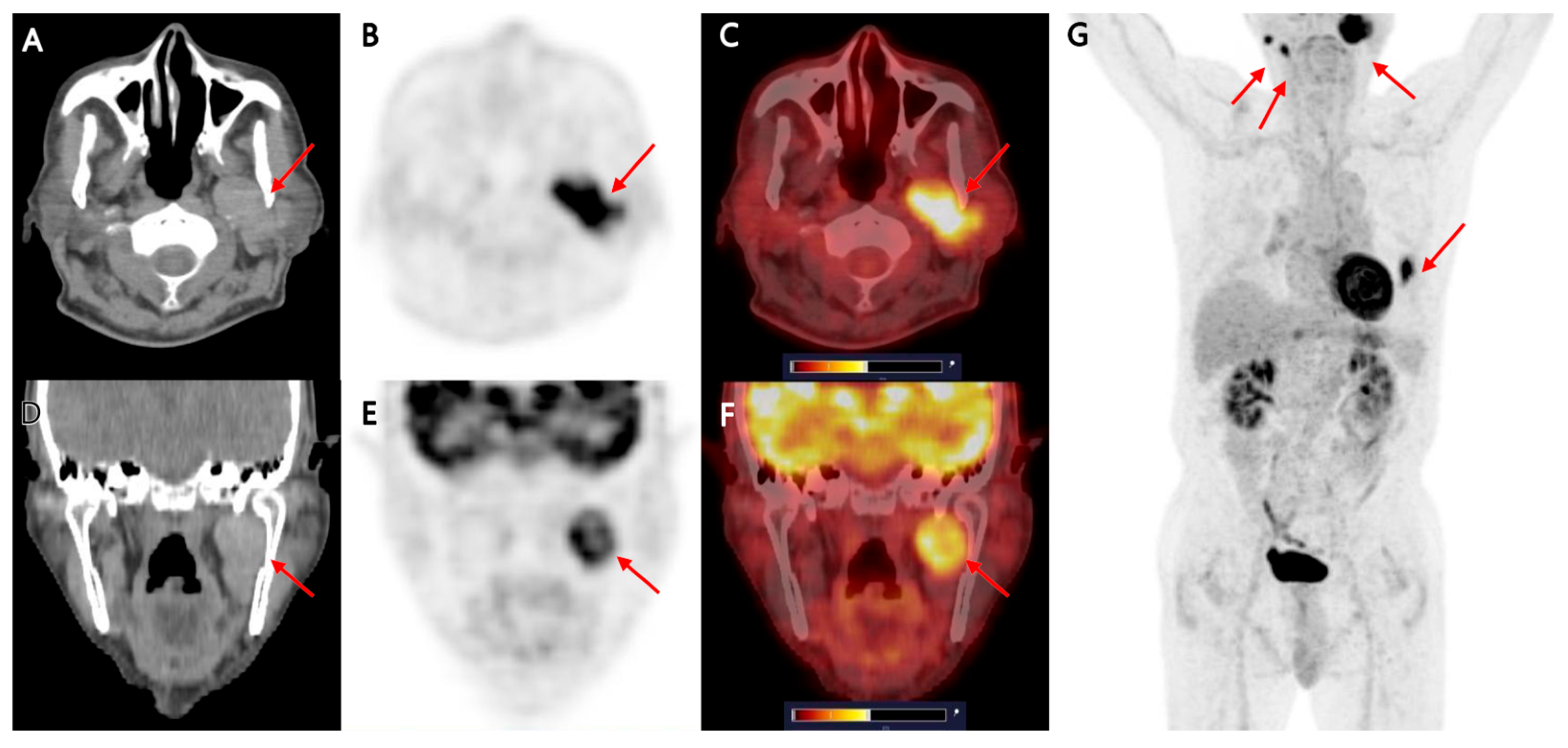 - Klug, T.E.; Hillerup, S.; Dias, A.H.; Gormsen, L.C.; Kristensen, P.N. Incidental [18F]FDG-avid focuses in parotid glands on PET/CT. Acta Otolaryngol. 2024, 144, 147–152. [Google Scholar] [CrossRef] [PubMed]