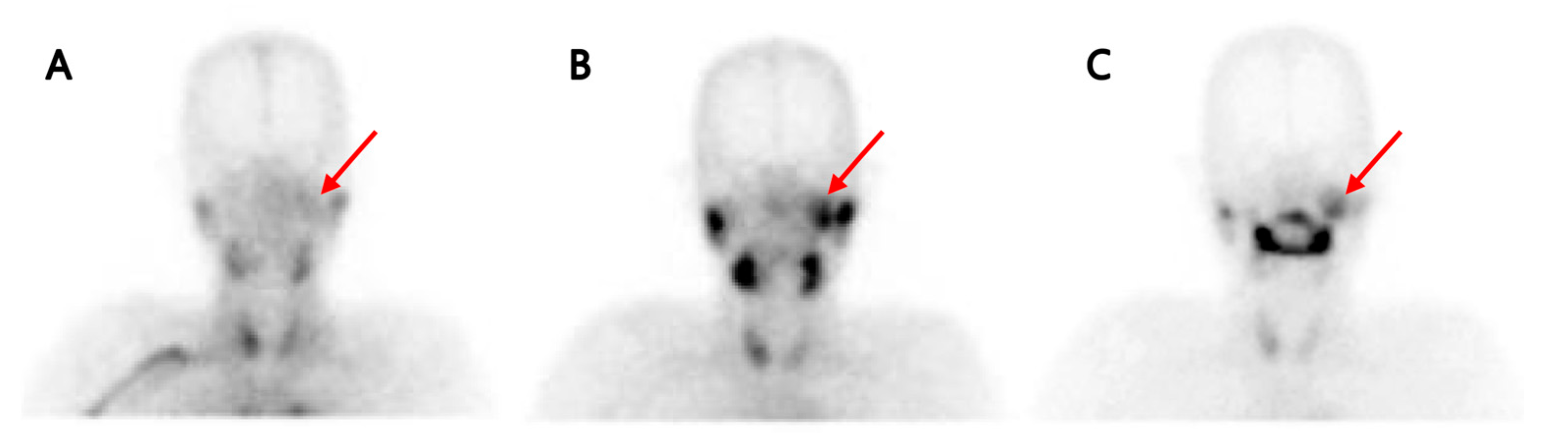- Nakahara, T.; Suzuki, T.; Hashimoto, J.; Shigematsu, N.; Tomita, T.; Ogawa, K.; Kubo, A. Role of salivary gland scintigraphy with Tc-99m pertechnetate in determining treatment of solitary parotid gland tumors: A retrospective study. Clin. Nucl. Med. 2007, 32, 363–366. [Google Scholar] [CrossRef] [PubMed]