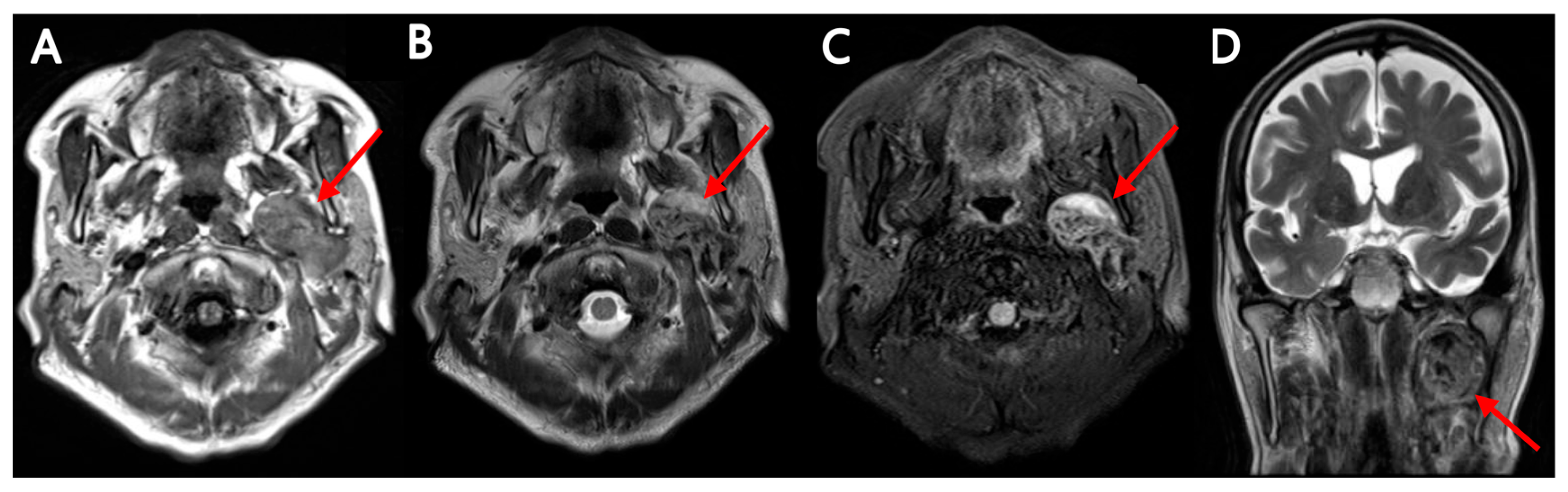 - Lee, H.J.; Kang, H.J.; Lee, J.H.; Lee, M.K.; Kim, S.I.; Lee, Y.C.; Eun, Y.G. MRI and CT imaging characteristics in parotid tumors with false-negative fine-needle aspirations. Head Face Med. 2024, 20, 64–71. [Google Scholar] [CrossRef] [PubMed]