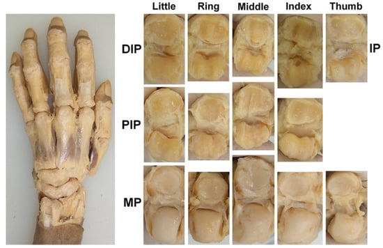 Subsequently, the articular cartilage was observed and evaluated. To observe the articular cartilage defects, the skin on the dorsal side of the hand was removed, and the dorsal joint capsule and both lateral collateral ligaments were dissected at each joint to fully expose the articular surface (Figure 1). The condition of each joint surface was visually inspected, and the distribution of the articular cartilage defects was recorded. All the anatomical dissections and observations were performed by a hand surgeon (RN). The joint surface where cartilage is preserved and the joint surface where the cortical bone is exposed due to cartilage loss can be easily distinguished by differences in color and texture. To confirm the reliability of the macroscopic evaluation, a histological evaluation was performed on 12 joints randomly selected from those where the cartilage defects were identified. Joint samples were refixed with 10% formalin solution, dehydrated and degreased with 100% ethanol, decalcified with Plank-Rychlo solution, neutralized with 5% sodium sulfate, dehydrated with 70–100% ethanol after washing with pure water, embedded in paraffin using an embedding apparatus (SAKURA SEIKI, Tissue-Tek VIP-5Jr, Nagano, Tokyo and Tokyo, Japan), sectioned into 5 μm-thick slices, stained with toluidine blue, and examined under a microscope.