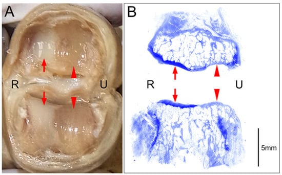An example of a cartilage defect at the joint surface (PIP joint of the right middle finger); R: radial side, U: ulnar side. (A) Macroscopic image of the joint surface showing preserved cartilage layers on the radial side (arrows) and complete cartilage defects (eburnation) on the ulnar side (arrowheads). (B) Coronal tissue sections of the specimen presented in A stained with toluidine blue after decalcification are shown. Histological examination of these sections revealed maintained cartilage layers that were stained dark with toluidine blue on the radial side (arrows) and cartilage defects with consequent thickening of the subchondral bones that were stained pale with toluidine blue on the ulnar side (arrowheads).