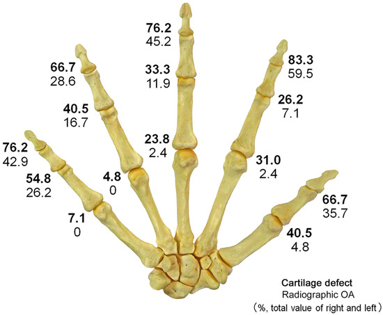 Distribution of cartilage defects and radiographic OA; The figure shows the prevalence (%) of cartilage defects and radiographic OA caused by joints combined for both sides. The upper numbers indicate cartilage defects (bold), and the lower numbers indicate radiographic OA. Cartilage defects and radiographic OA are most common in DIP joints and relatively less common in MP joints. In all joints, the prevalence of cartilage defects was higher than that of radiographic OA.