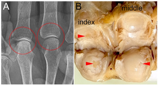 MP joint surfaces with cartilage defects and their X-ray images: (A) A X-ray image of the gross sample presented in B, taken prior to dissection, is shown. No changes suggestive of OA are observed in the MP joints of the index and middle fingers (circled areas). (B) Macro-anatomical examination revealed cartilage defects in the MP joints of the index and middle fingers (arrowheads).