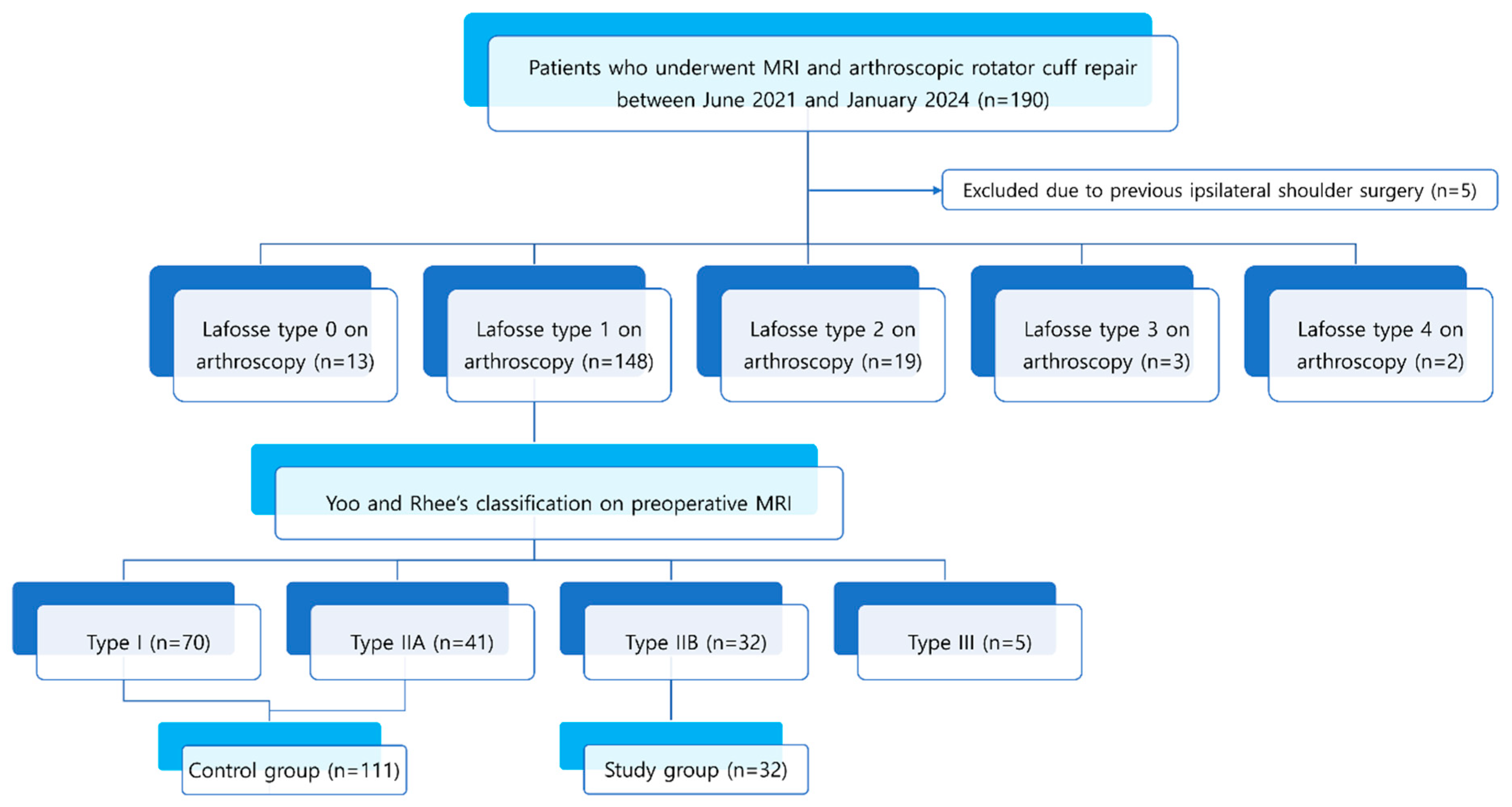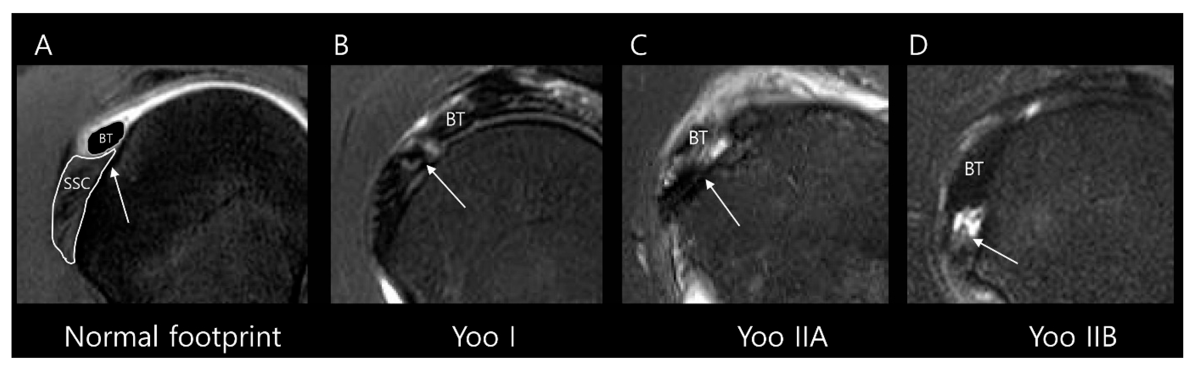 - Ahn, T.R.; Yoon, Y.C.; Yoo, J.C.; Kim, H.S.; Lee, J.H. Diagnostic performance of conventional magnetic resonance imaging for detection and grading of subscapularis tendon tear according to Yoo and Rhee classification system in patients underwent arthroscopic rotator cuff surgery. Skelet. Radiol. 2022, 51, 659–668. [Google Scholar] [CrossRef]