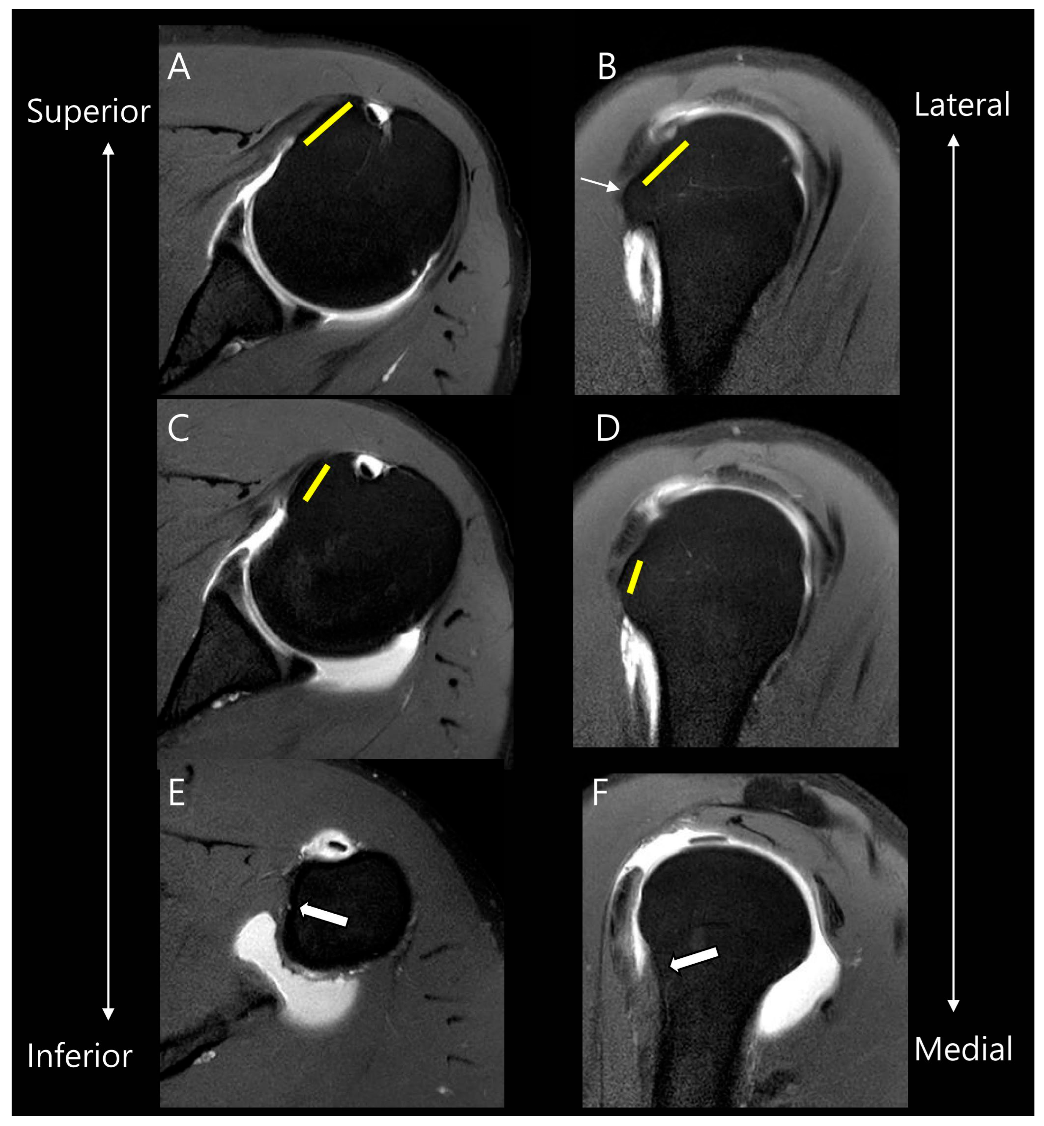 - Ryu, H.Y.; Song, S.Y.; Yoo, J.C.; Yun, J.Y.; Yoon, Y.C. Accuracy of sagittal oblique view in preoperative indirect magnetic resonance arthrography for diagnosis of tears involving the upper third of the subscapularis tendon. J. Shoulder Elb. Surg. 2016, 25, 1944–1953. [Google Scholar] [CrossRef] [PubMed]