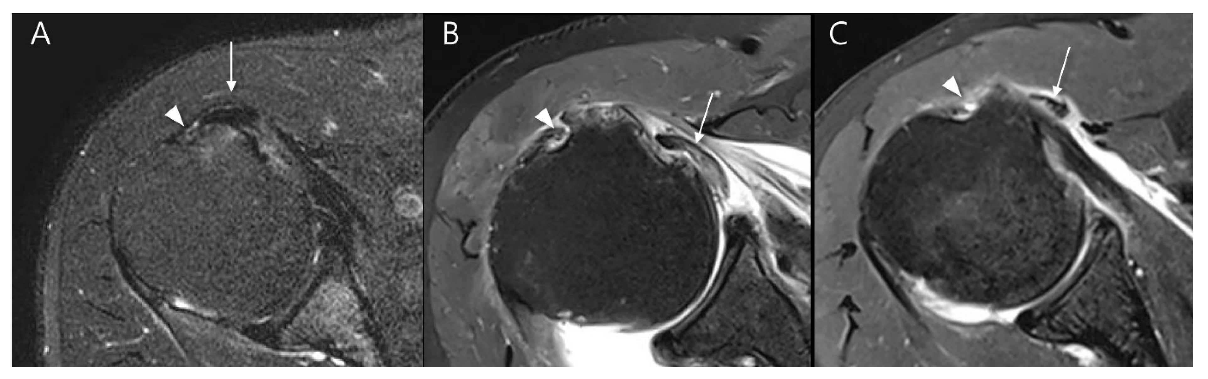 - Lee, J.H.; Rhyou, I.H.; Ahn, K.B. Prediction of the anterior shoulder pain source by detecting indirect signs for partial articular subscapularis tendon tears through conventional magnetic resonance imaging. Knee Surg. Sports Traumatol. Arthrosc. 2021, 29, 2297–2304. [Google Scholar] [CrossRef]