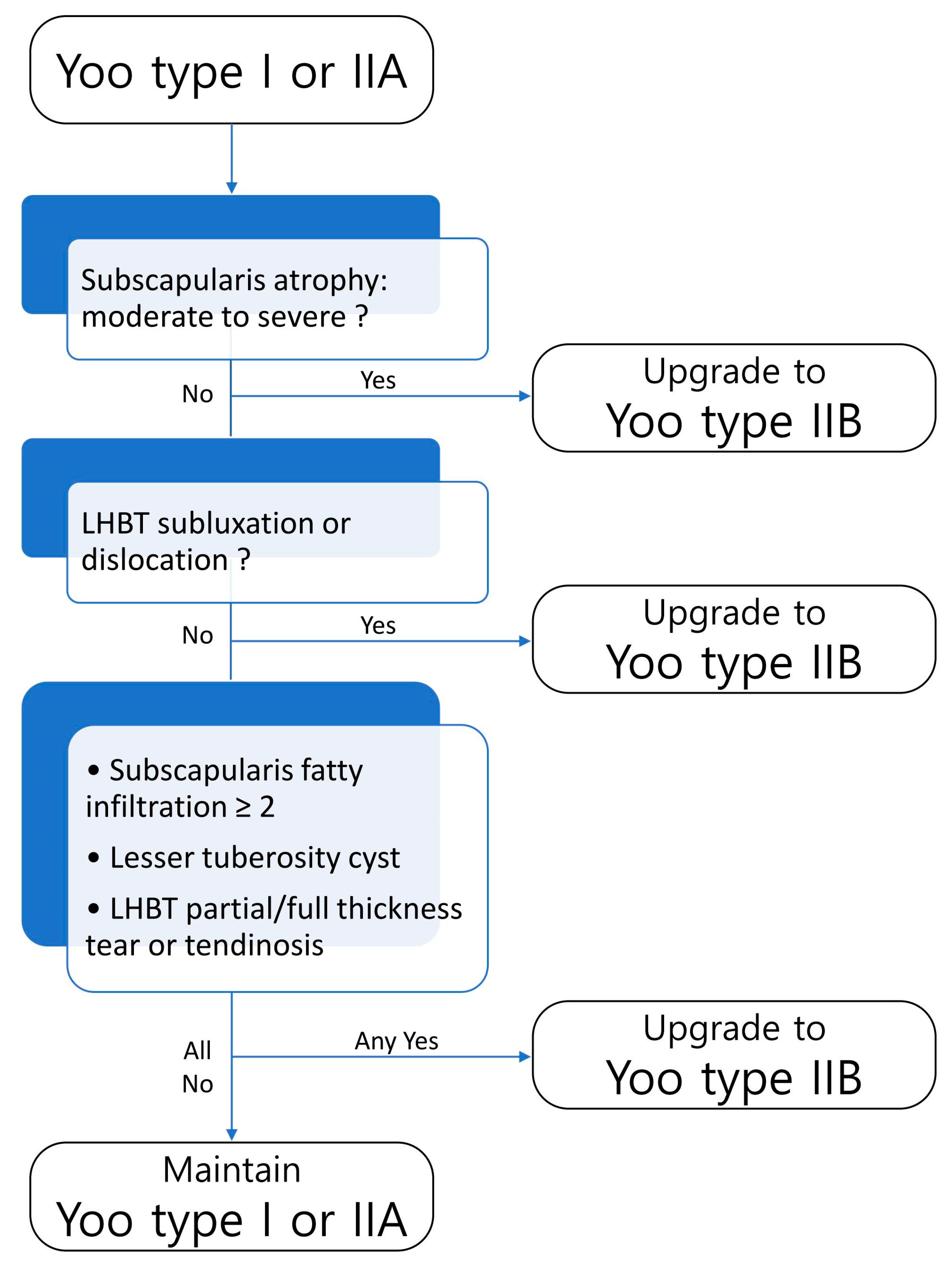 - Yoon, T.H.; Kim, S.J.; Choi, Y.R.; Oh, J.H.; Chun, Y.M. Comparison of the Goutallier Classification of Fatty Infiltration for the Subscapularis With a Novel Modified Classification. Orthop. J. Sports Med. 2023, 11, 23259671231174428. [Google Scholar] [CrossRef]