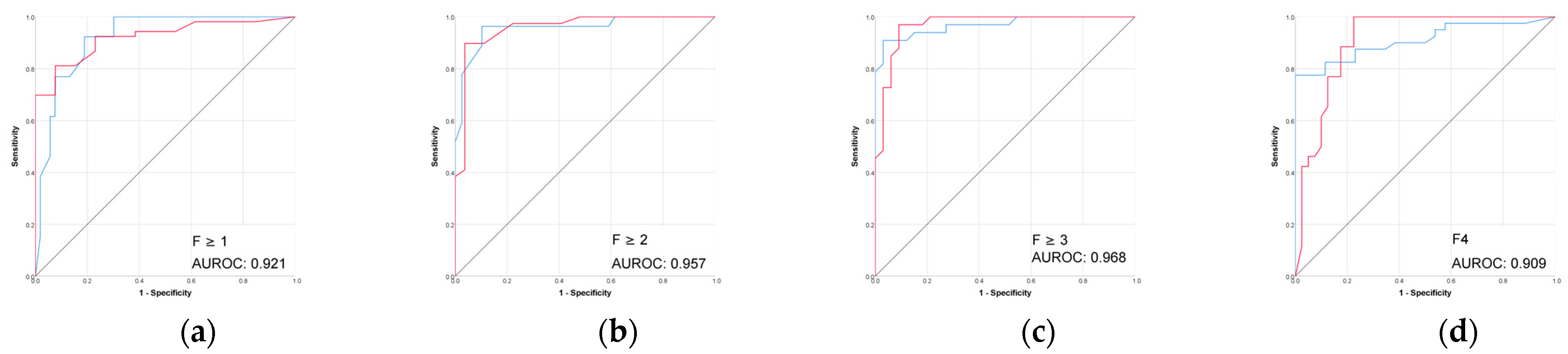 | Fibrosis Stage | F ≥ 1 | F ≥ 2 | F ≥ 3 | F4 | ||||