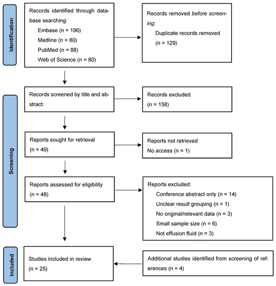 A literature search of articles up to 29 July 2024 was conducted in bibliographic databases, including Embase, Medline, PubMed, Scopus, and Web of Science. Relevant medical subject headings and search terms were used, such as “MOC31”, “cytology”, “effusion”, “fluid”, “accuracy”, “sensitivity”, “specificity”, and “diagnosis”. The detailed search strategy is provided in the Supplementary Materials. The reference lists of the included studies were also screened for additional studies. EndNote (version 20.1) was used to manage references.