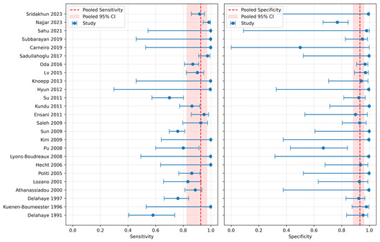 Forest plots of overall sensitivity (0.926, 95% CI: 0.827–0.971) and specificity (0.932, 95% CI: 0.883–0.961) [11,12,13,14,15,16,17,18,19,20,21,22,23,24,25,26,27,28,29,30,31,32,33,34,35].
