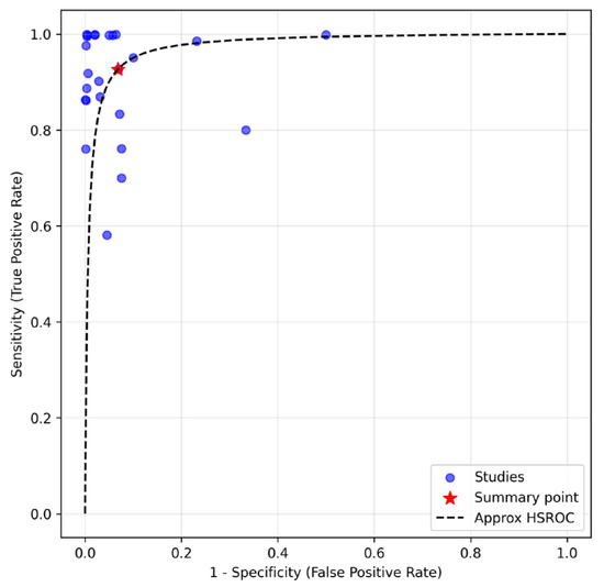 Area under curve of hierarchical summary receiver operating characteristic (AUC-HSROC).