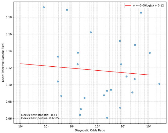 The publication bias of the included studies was assessed using Deeks’ test. The Deeks’ funnel plot did not show significant asymmetry by visual inspection, and the Deeks’ test p-value (p = 0.684) indicated a low risk of publication bias (Figure 4).