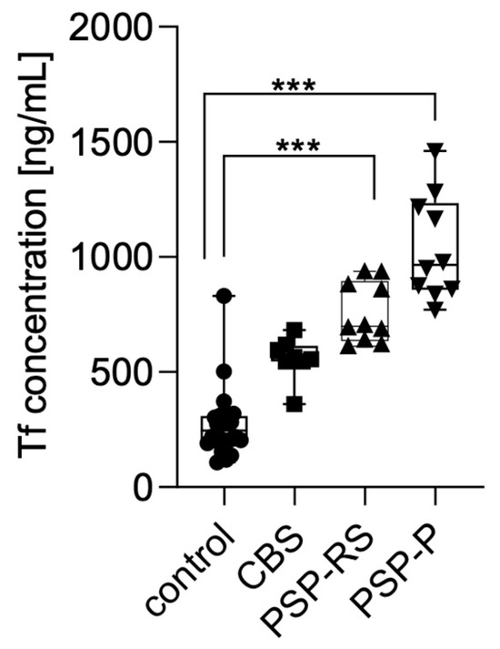 Serum transferrin levels were measured using enzyme-linked immunosorbent assay (ELISA) and compared across the analyzed groups. Statistical significance was calculated using analysis of variance followed by Dunne’s post hoc test. The highest concentrations were observed in patients with PSP-P, followed by PSP-RS and CBS. Statistically significant differences were found between PSP-P and healthy controls (p < 0.0001) and PSP-RS and healthy controls (p < 0.0001). No other statistically significant differences were found. No significant differences were observed between the tauopathic syndromes (CBS, PSP-RS, and PSP-P); moreover, the CBS group did not significantly differ when compared with controls. Results are presented in Figure 1.