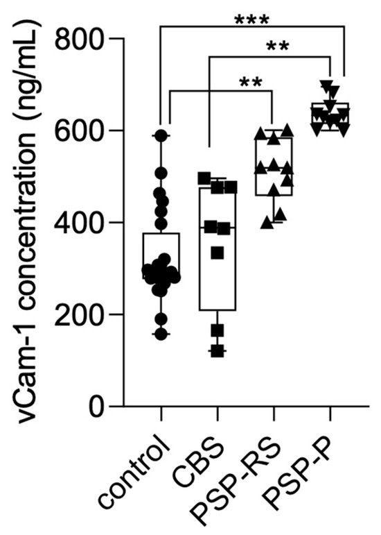 Serum VCAM-1 concentrations were also measured using ELISA and compared across the analyzed groups. Statistical significance was calculated using analysis of variance followed by Dunne’s post hoc test. The highest levels were observed in the PSP-P group. Significant differences were found between PSP-P and healthy controls (p < 0.0001), PSP-P and CBS (p < 0.001), and PSP-RS and healthy controls (p < 0.001). No other statistically significant differences were found. Results are presented in Figure 2.