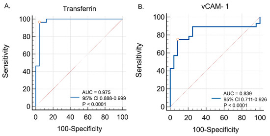 Diagnostic utility of (A) serum transferrin and (B) serum vCAM-1 in distinguishing tauopathic APS patients from controls—ROC curve analysis.