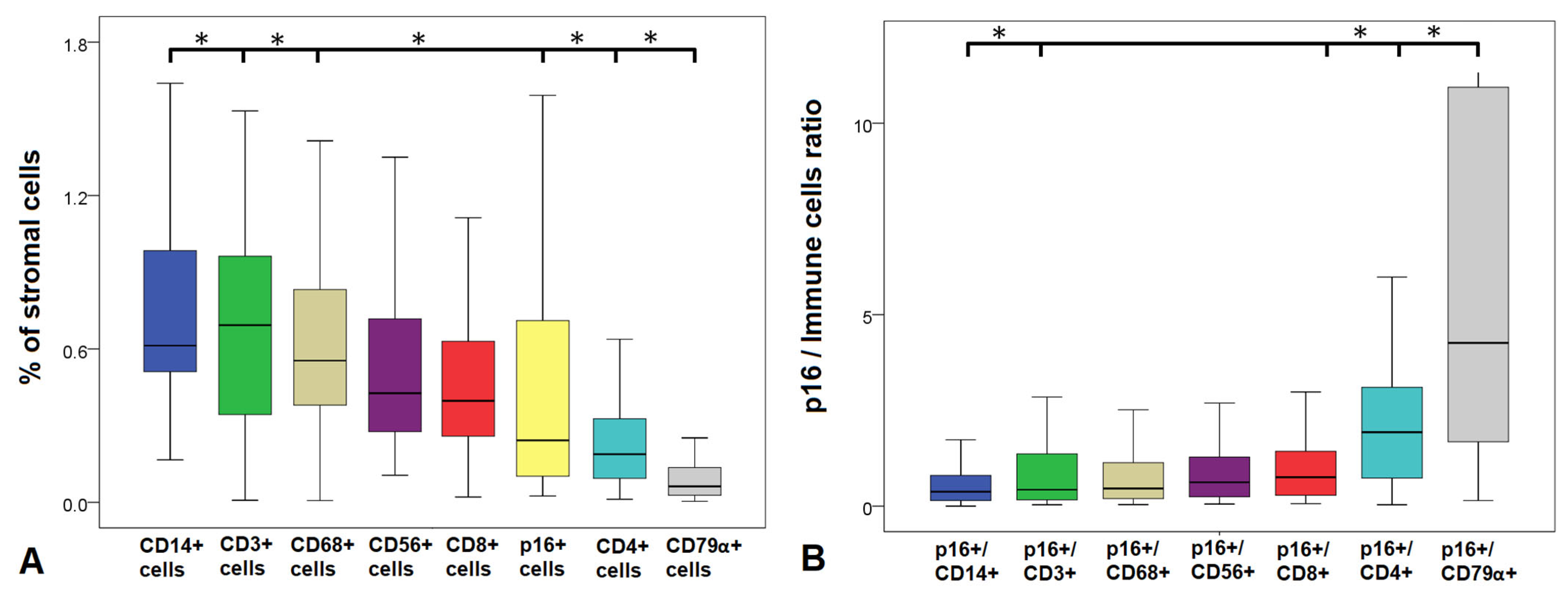 Statistical comparison showed that the proportion of senescent cells was significantly lower than that of CD3+ (p = 0.04), CD14+ (p = 0.01), and CD68+ cells (p = 0.01), but significantly higher than the proportion of CD4+ T-helper cells (p = 0.01) and B cells (p = 0.01). No significant differences were observed between p16+ cells and CD8+ (p = 0.76) or CD56+ NK cells (p = 0.28).