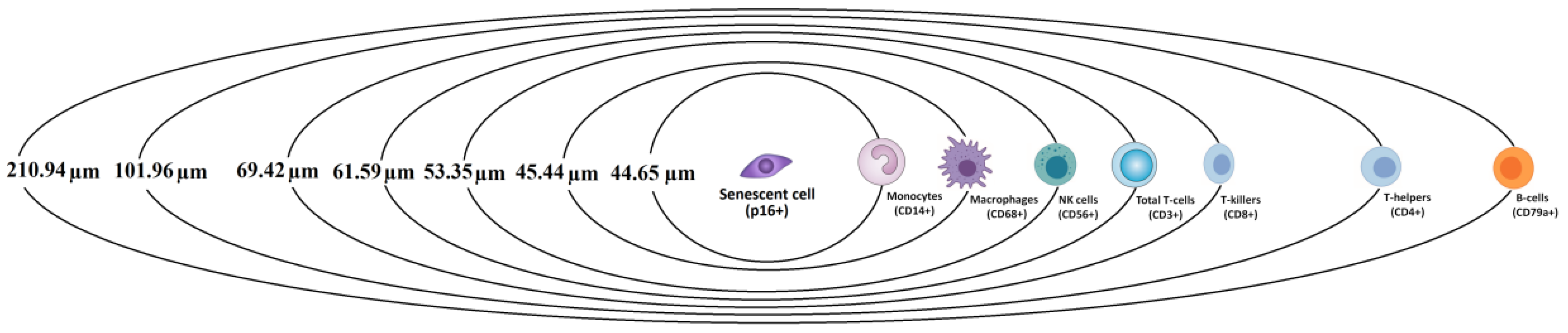 Figure 4. A schematic representation of the results from the performed nearest neighbor analysis. The average distances from the studied immune cells to the nearest senescent cell.