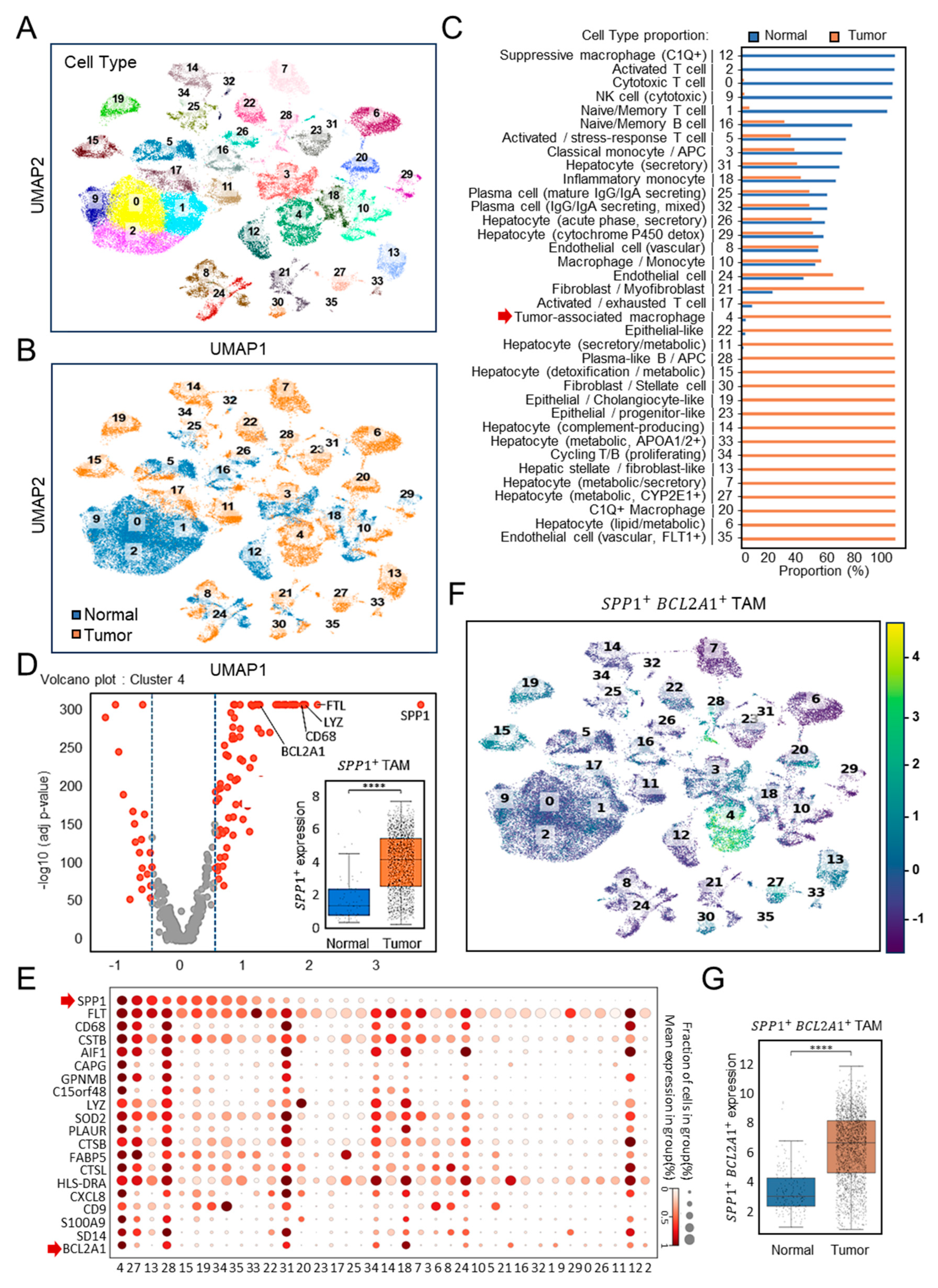 Figure 1. Single-cell transcriptomic profiling of SPP1+BCL2A1+ TAMs in the HCC discovery cohort (GSE149614). (A) UMAP plots showing the clustering of immune and non-immune cell subsets. (B) UMAP plots of paired (n = 10) normal versus tumor tissues. Cell identities were annotated using canonical marker genes. (C) Quantification of cell-type proportions between tumor and normal samples. Cluster 4 represented TAMs (red arrow). (D) Volcano plot showing high-dimensional gene expression in cluster 4 of SPP1+ TAMs. Boxplot shows SPP1+ TAM scores comparing normal versus tumor samples. **** p < 0.0001. (E) scRNA-seq dot plot illustrating the expression of the top 20 canonical marker genes across immune cell clusters, highlighting SPP1+ and BCL2A1+ gene expression (red arrow) mainly enriched in cluster 4. (F) UMAP plots showing the clustering of SPP1+BCL2A1+ TAMs, specifically enriched in cluster 4, in paired normal versus tumor tissues. (G) Quantification of SPP1+BCL2A1+ TAMs between tumor and normal samples. **** p < 0.0001.