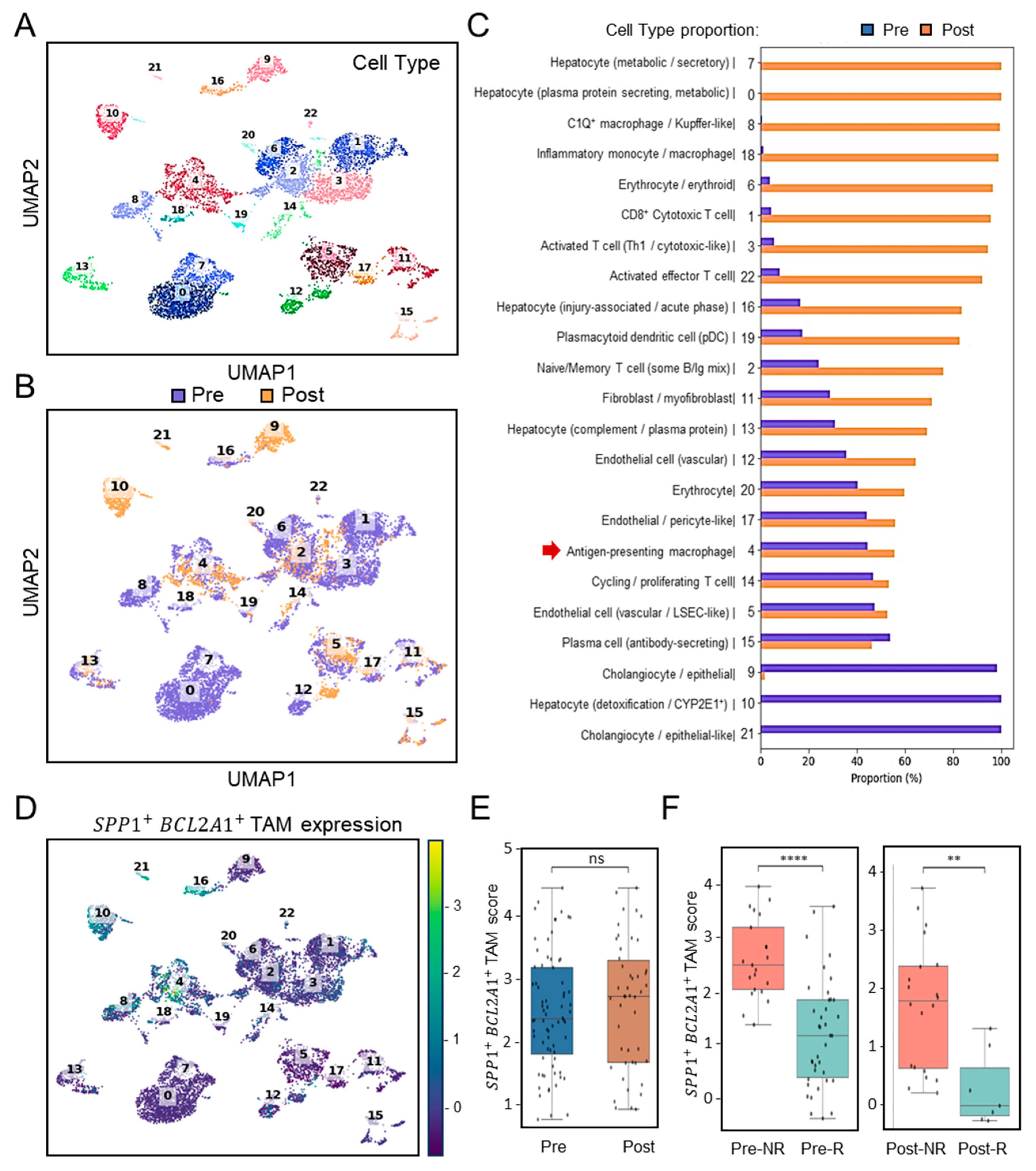 Figure 2. Single-cell transcriptomic profiling and association of SPP1+BCL2A1+ TAMs enrichment in HCC patients with ICB response (GSE151530). (A) UMAP plot showing clustering of immune and non-immune cell subsets from paired (n = 7) pre- and post-treatment samples. (B) UMAP plot highlighting pre- (blue) and post-treatment (orange) cell distribution. (C) Quantification of cell-type proportions between pre- and post-treatment samples. Notably, antigen-presenting macrophages (cluster 4, red arrow) were enriched post-treatment. (D) UMAP plot displaying SPP1+BCL2A1+ TAM expression, mainly identified in cluster 4, across pre- and post-treatment tissues. (E) Boxplot quantifying SPP1+BCL2A1+ TAMs scores between pre- and post-treatment groups. ns, not significant. (F) Stratified analysis of SPP1+BCL2A1+ TAMs scores in non-responders (NRs; n = 1; Pre versus Post, 21 and 20 positive cells) and responders (Rs; n = 3; Pre versus Post, 38 and 7 positive cells) pre- and post-treatment. **** p < 0.0001, ** p < 0.01.