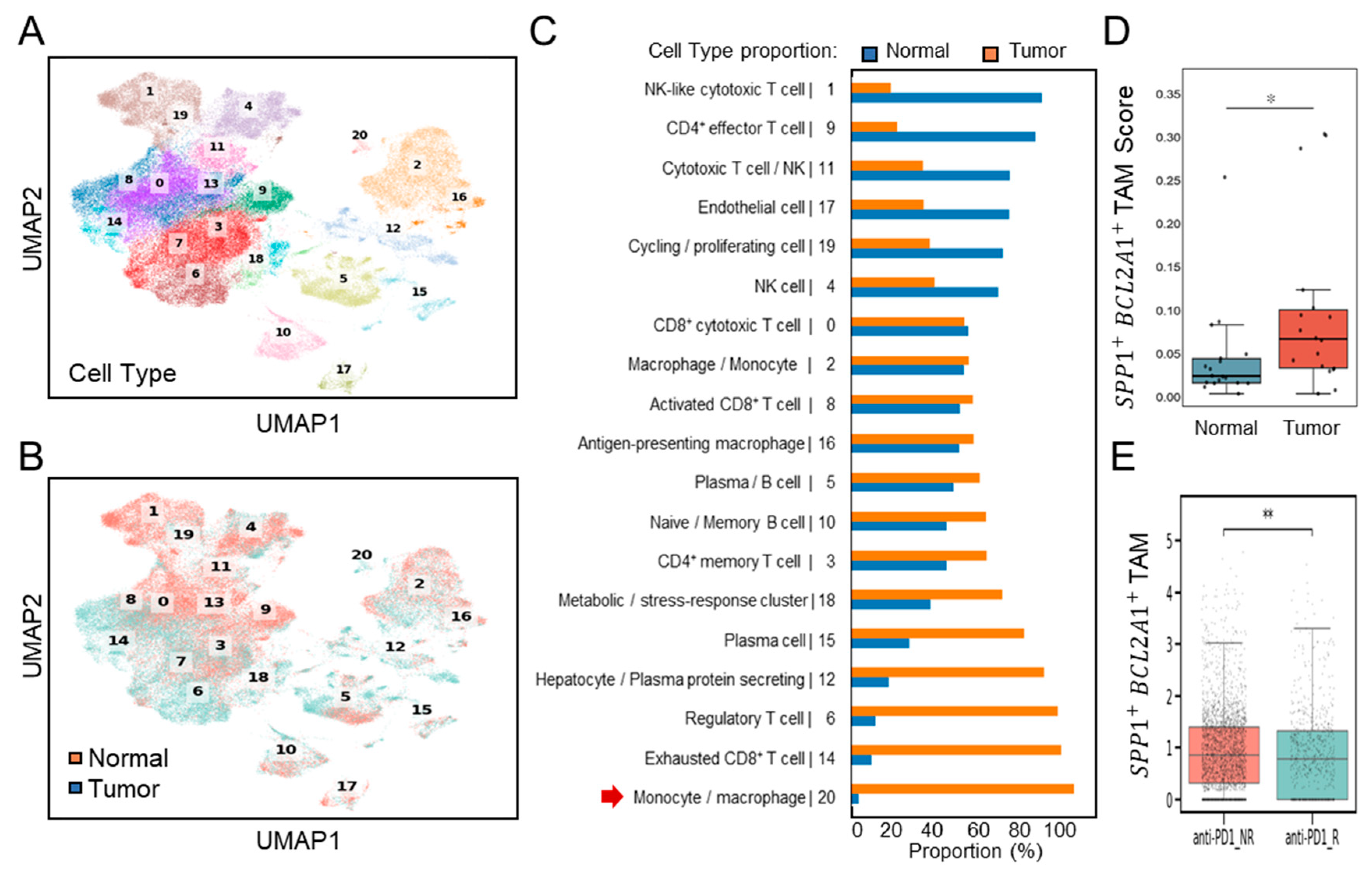 Figure 3. Single-cell transcriptomic profiling of SPP1+BCL2A1+ TAMs in an independent HCC cohort (GSE206325) for validation. (A) UMAP plot showing clustering of immune and non-immune cell subsets. (B) UMAP plot highlighting paired (n = 18) normal and tumor cell distribution. (C) Quantification of cell-type proportions between normal and tumor samples, with enrichment of monocyte/macrophage cluster 20 (red arrow) in tumor tissues. (D) Boxplot showing SPP1+BCL2A1+ TAMs scores in normal versus tumor tissues. * p < 0.05. (E) Boxplot showing SPP1+BCL2A1+ TAM levels in anti–PD-L1 non-responders (NRs; n = 12) and responders (Rs; n = 6). ** p < 0.01.