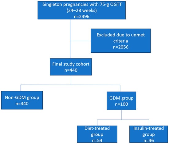 A total of 2496 pregnant women with singleton pregnancies who underwent a 75 g OGTT between 24 and 28 gestational weeks were initially identified from the institutional database. Following the application of predefined exclusion criteria, 2056 women were excluded, leaving a final analytical cohort of 440 eligible participants (Figure 1). The overall prevalence of GDM was quantified at 22.7% per IADPSG criteria. Among women diagnosed with GDM, 64% had one glucose value above the diagnostic threshold, 29% had two values above the threshold, and 7% had all three values above the threshold. Of the patients diagnosed with GDM, 46% were administered insulin therapy. A detailed comparison of baseline demographic and clinical characteristics between patients with and without GDM is presented in Table 1.