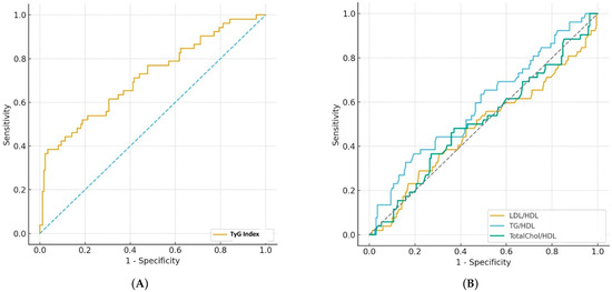(A) ROC curve illustrating the diagnostic performance of the TyG index compared with the reference standard, 75 g OGTT, for the detection of GDM. (B) ROC curves illustrating the diagnostic performance of the LDL/HDL, TG/HDL AND TC/HDL ratios compared with the reference standard, 75 g OGTT, for the detection of GDM (Dotted lines indicate the chance diagonal).