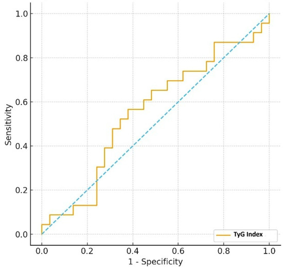Furthermore, the ability of the TyG index to differentiate between those managed with diet (n = 54) and those requiring insulin therapy (n = 46) was assessed. The TyG index demonstrated poor discriminative capacity, with an AUC of 0.553. The optimal cut-off value was determined as 9.16, providing a sensitivity of 56.5% and a specificity of 62.1%, and the negative predictive value was 64.3% (Figure 3).