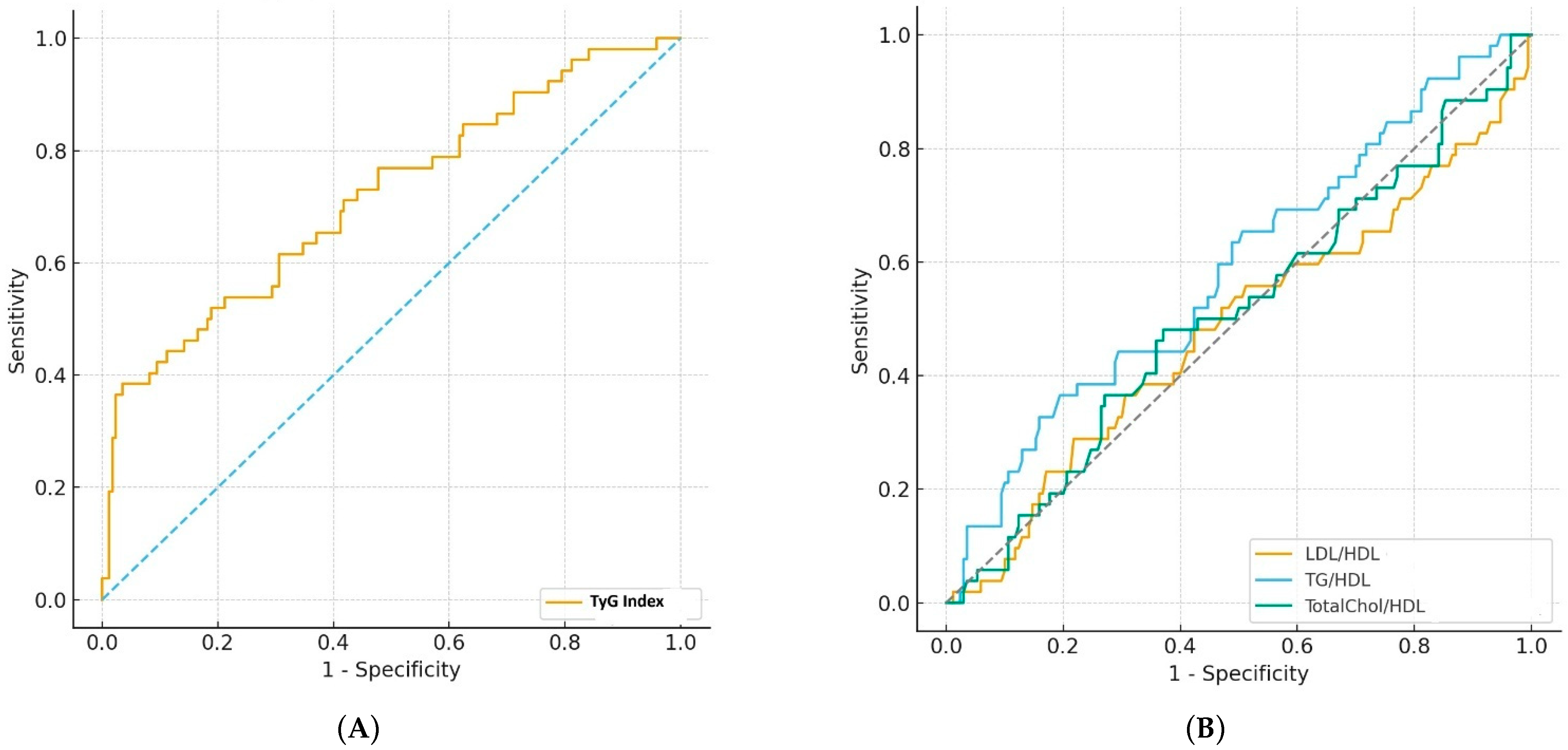- Santos, G.G.S.; Souza, F.D.; Montero, M.F.; Jordão, M.C.; Oliveira, M.C.M.; Janovsky, C.C.; Mattar, R.; Dib, S.A.; Dualib, P.M.; de Almeida-Pititto, B. Triglyceride/High-Density Lipoprotein Cholesterol (TG/HDL) Ratio May Predict Gestational Diabetes and Worse Cardiometabolic Profile. Cureus 2025, 17, e85505. [Google Scholar] [CrossRef]