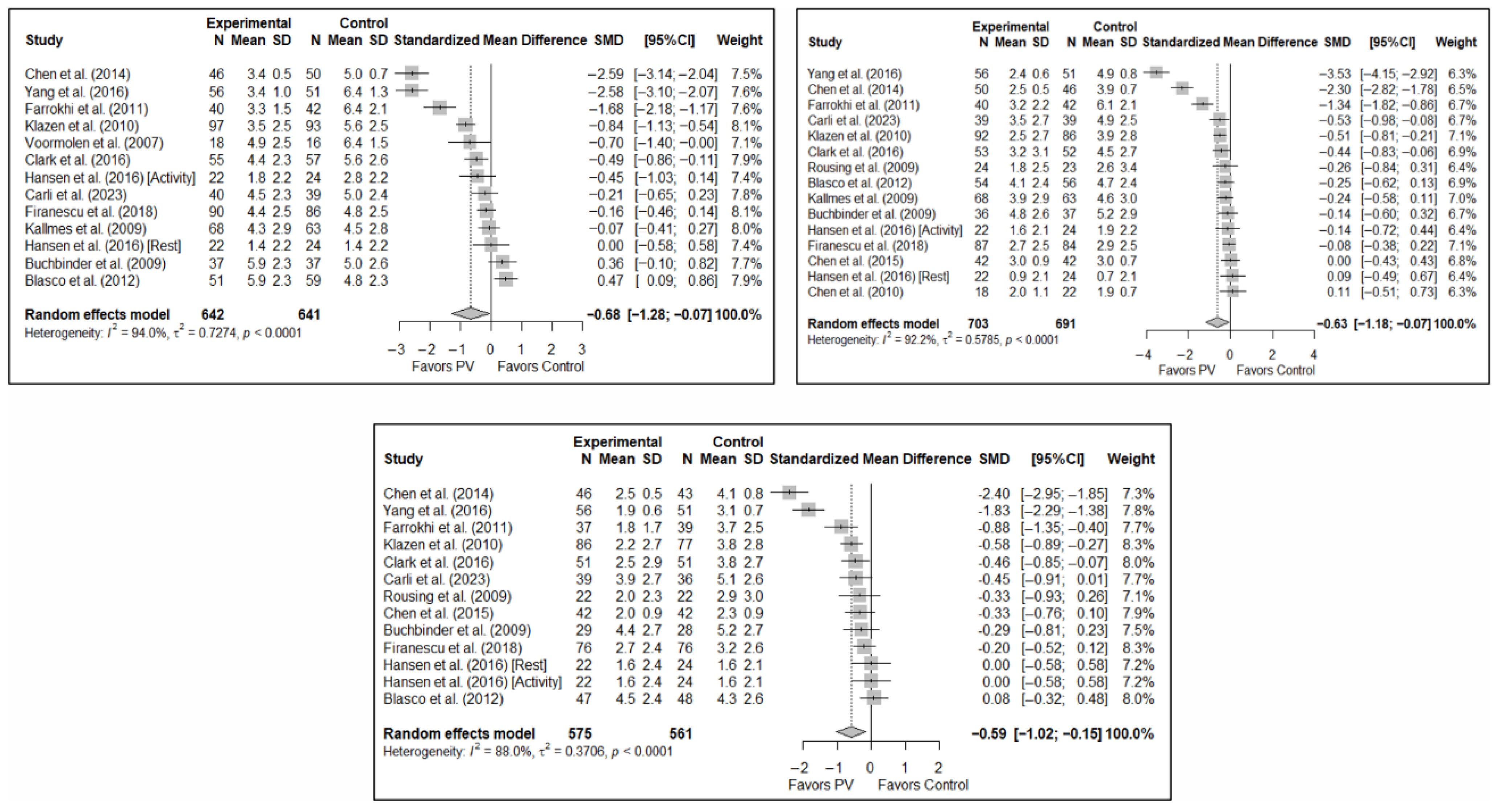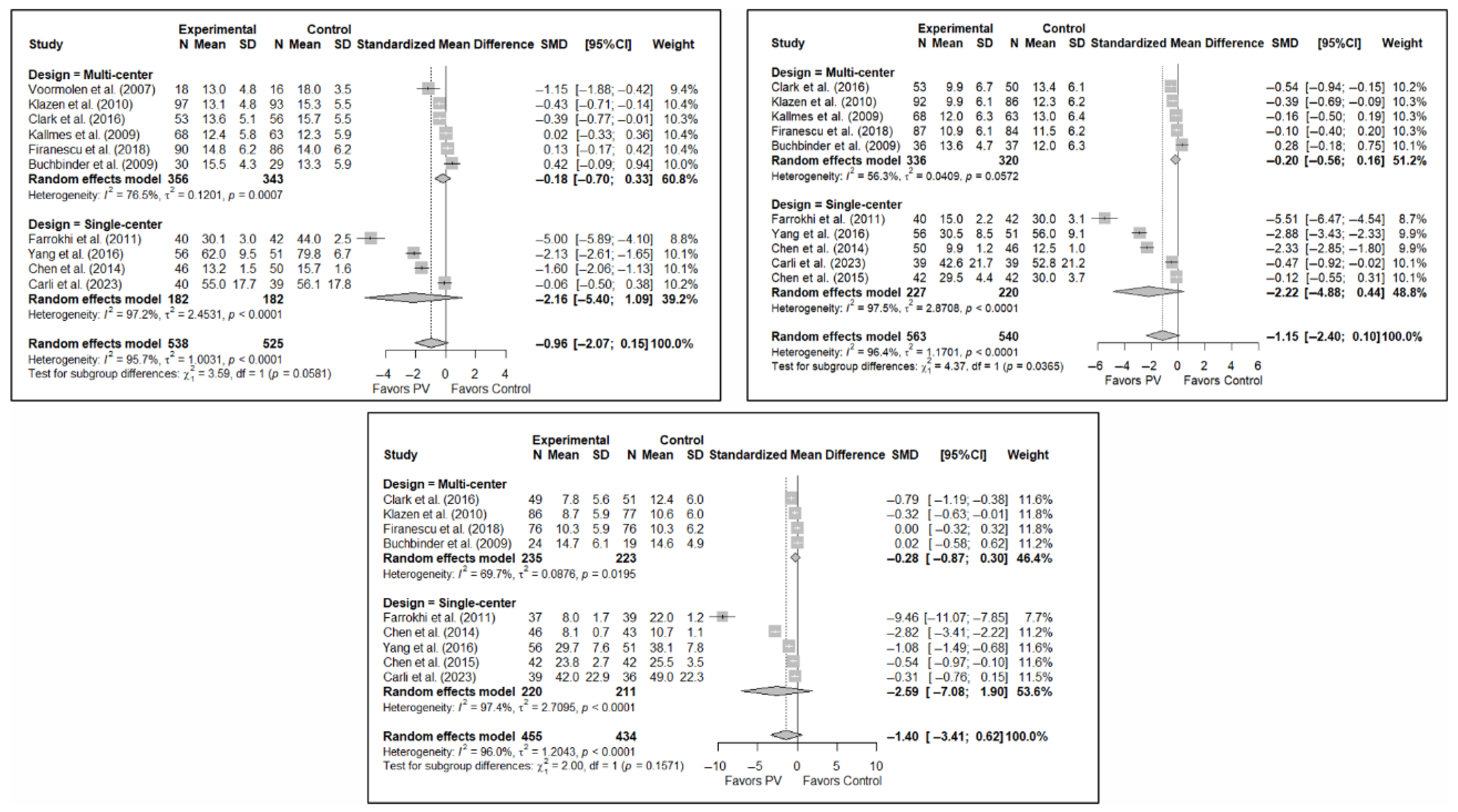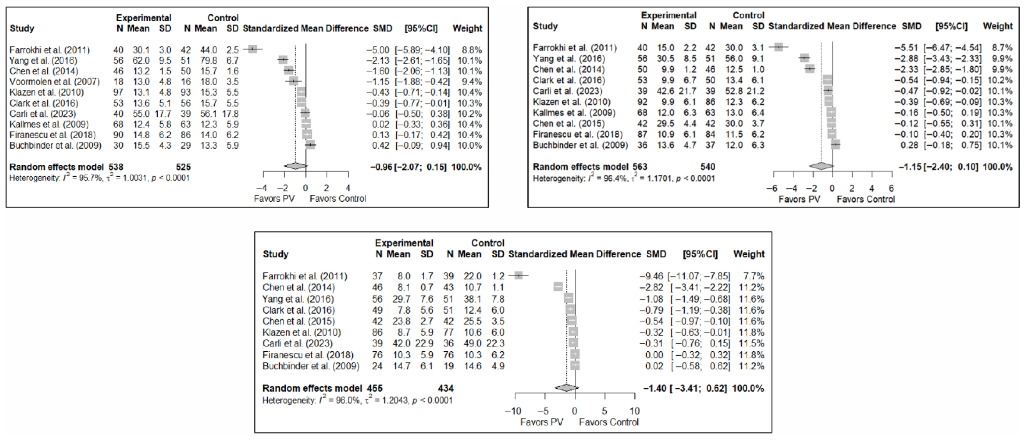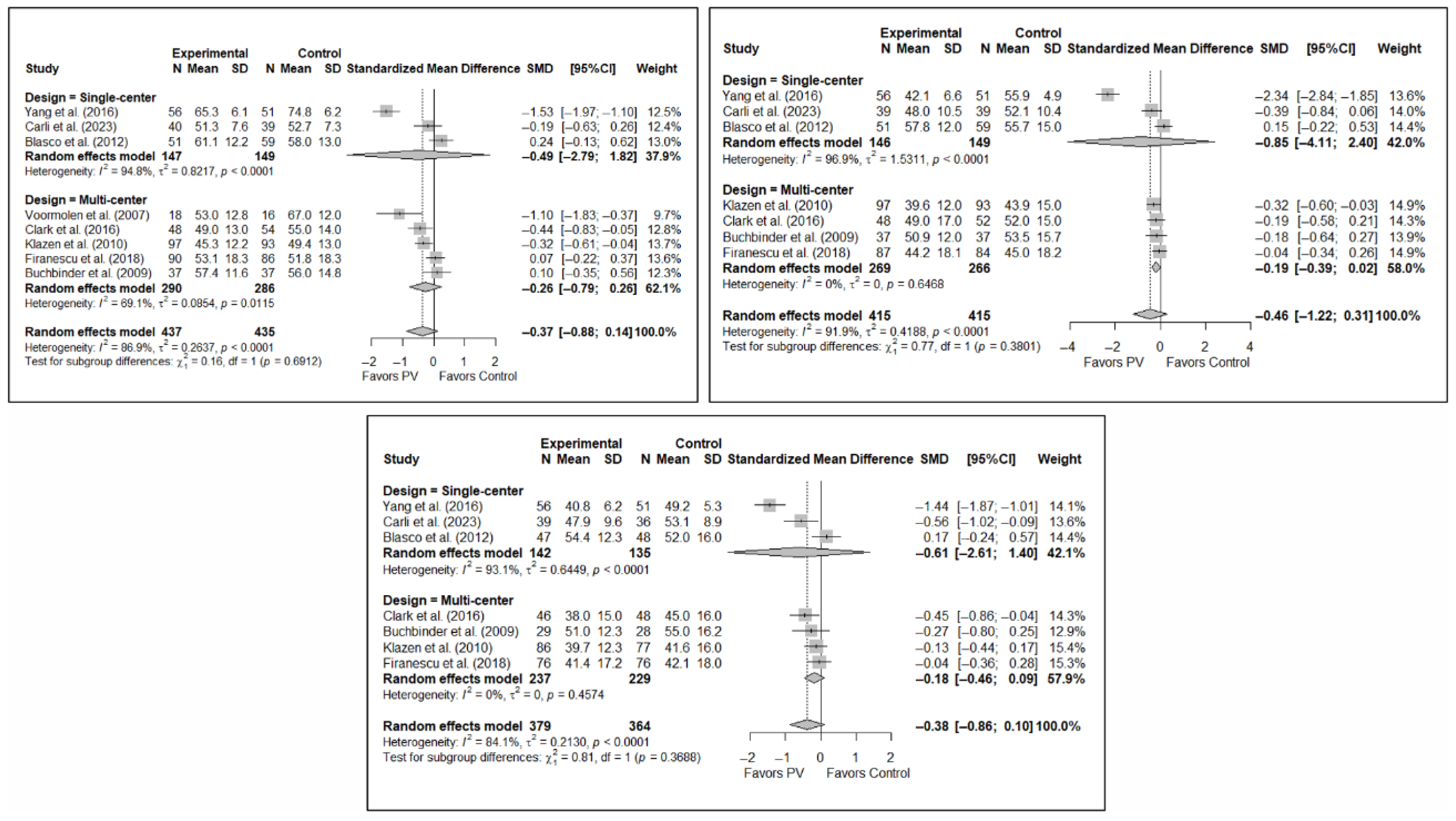 | Chen et al. (2014) [50] | PV | 46 | 64.6 (9.1) | 14/32 | 7.1 (3) | 12 | 6.5 (0.9) | 18.6 (1.8) | 59.9 (2.2) | - |