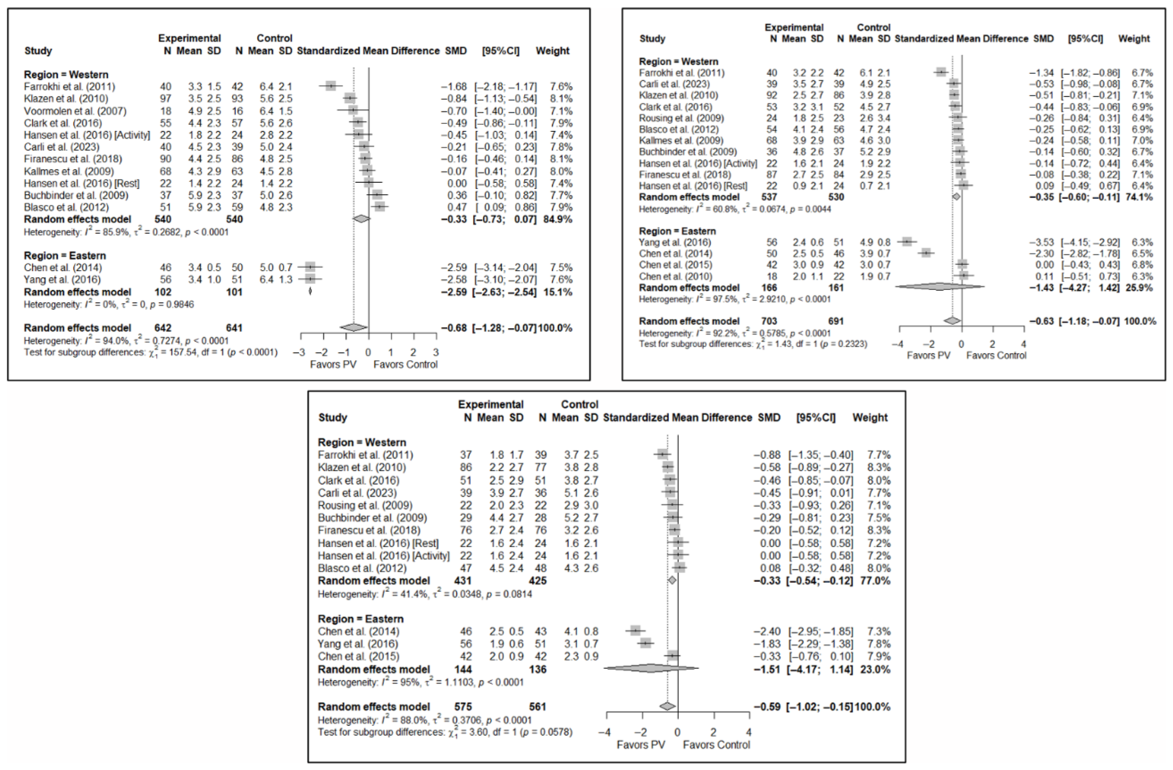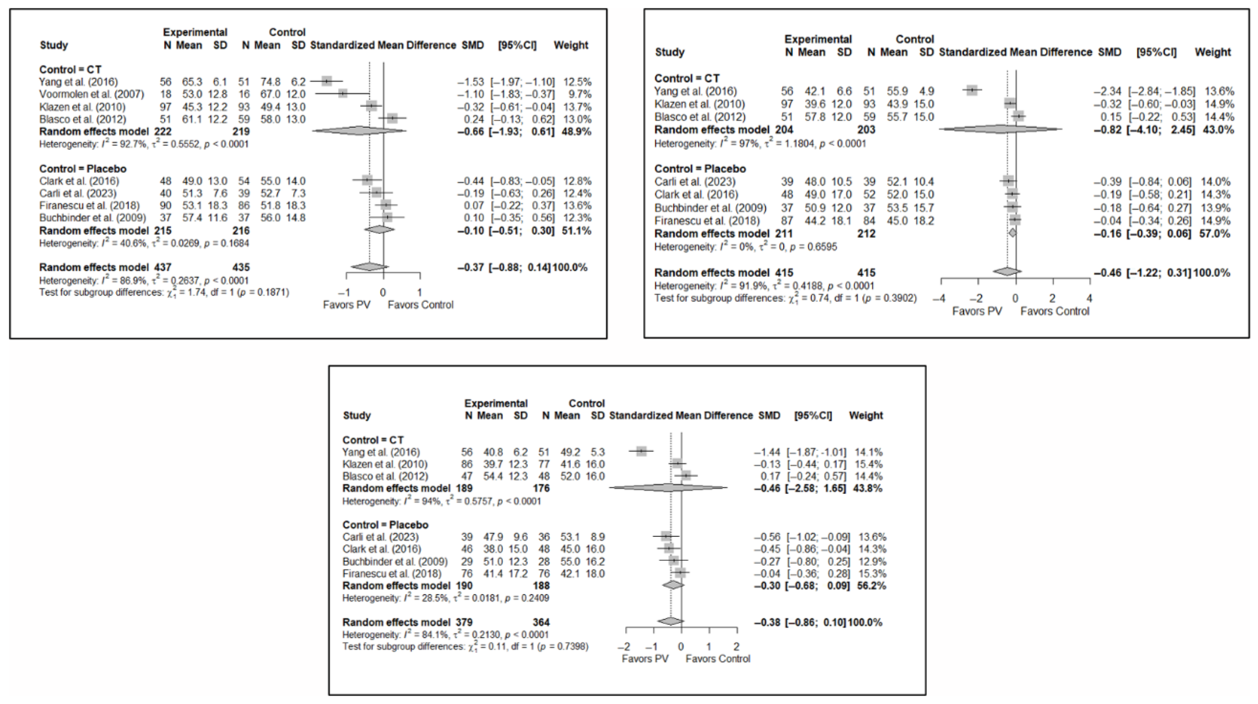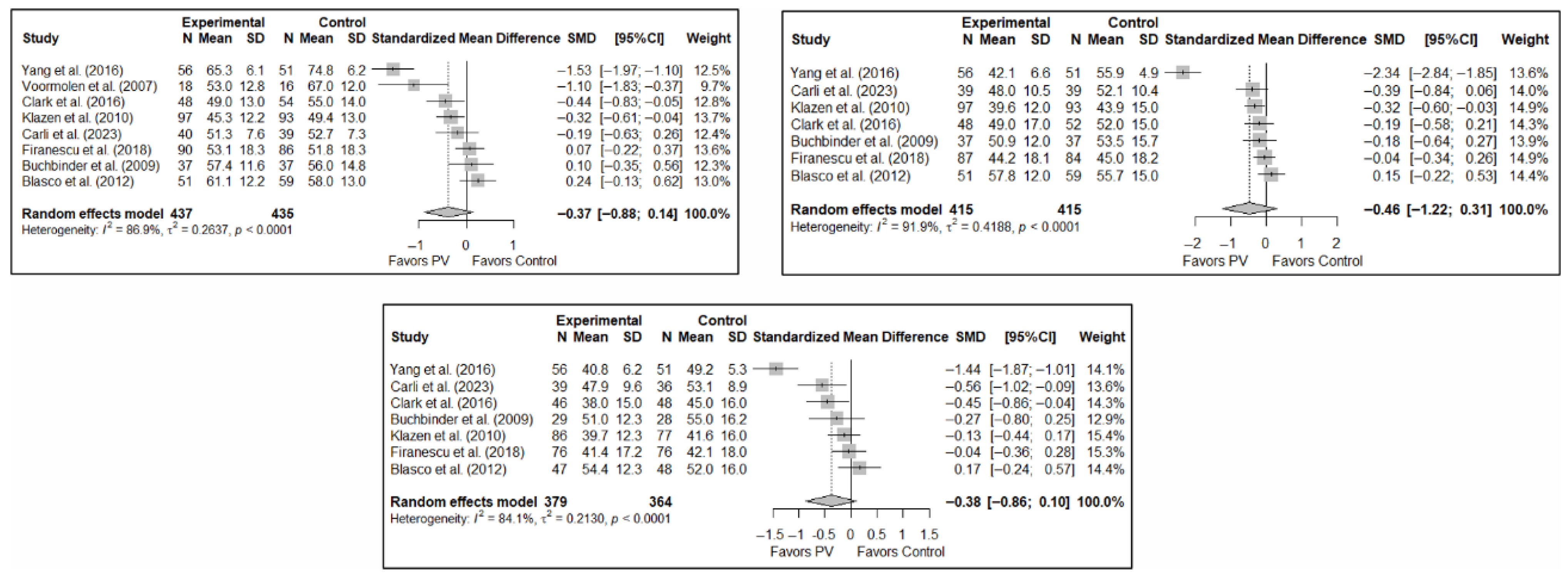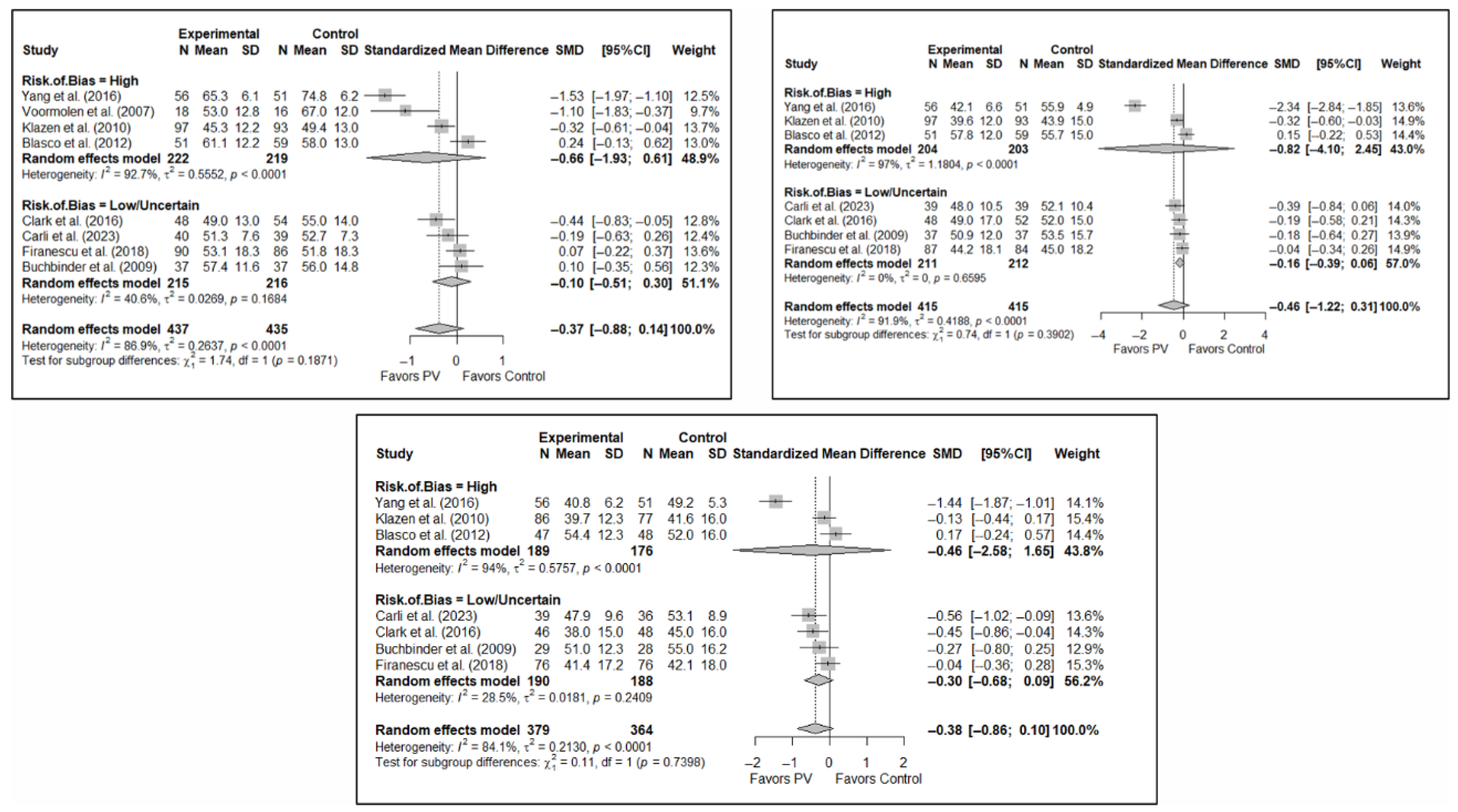 | Chen et al. (2014) [50] | PV | 46 | 64.6 (9.1) | 14/32 | 7.1 (3) | 12 | 6.5 (0.9) | 18.6 (1.8) | 59.9 (2.2) | - |