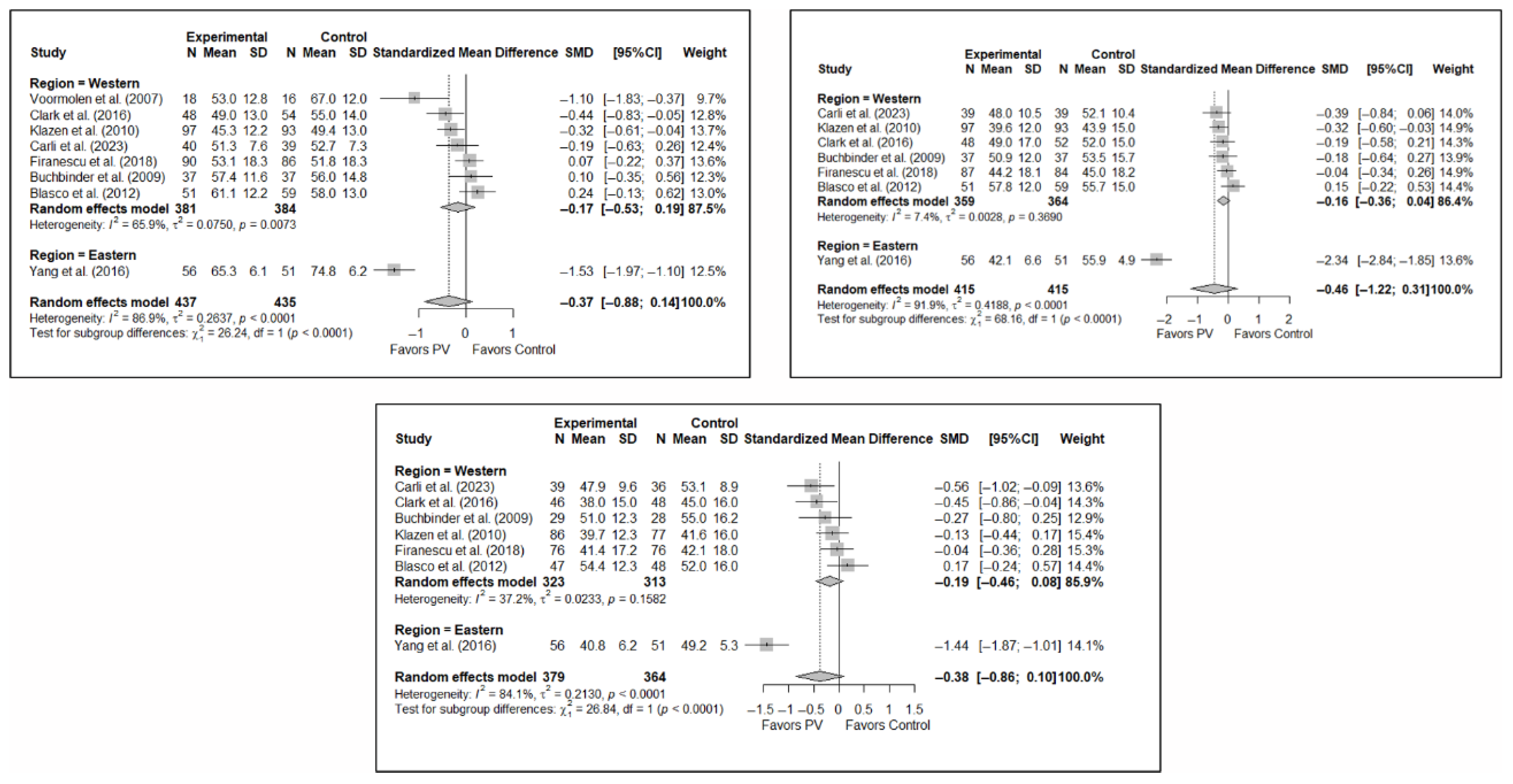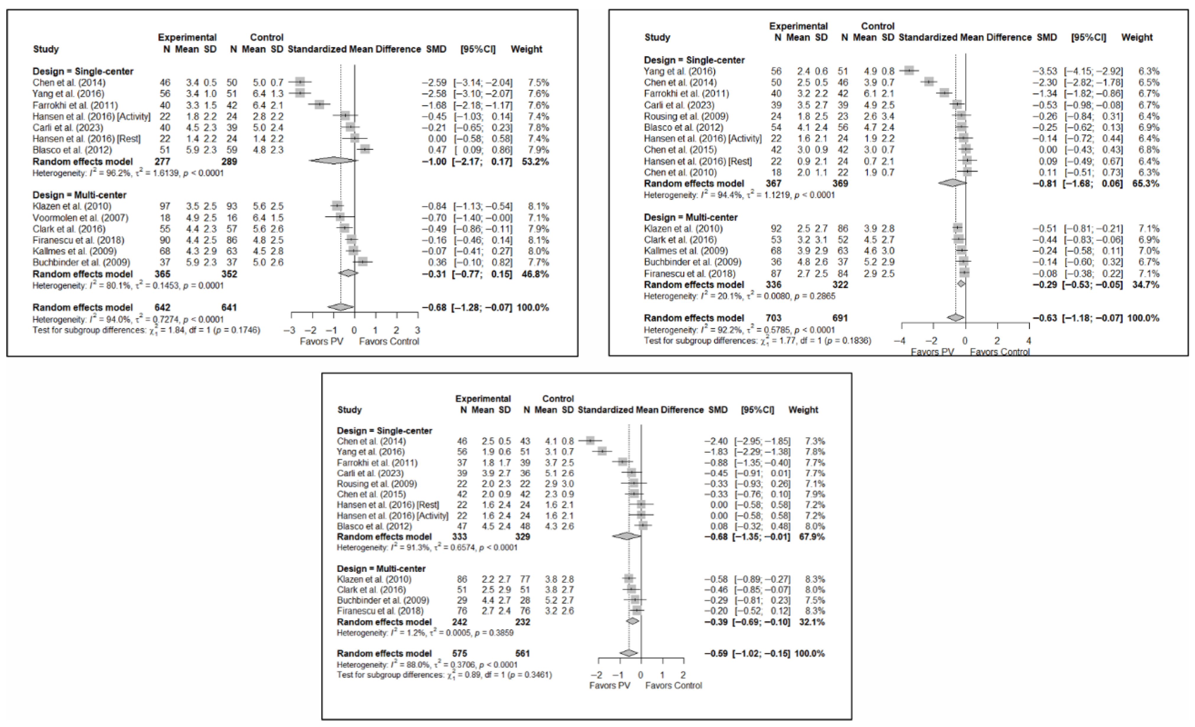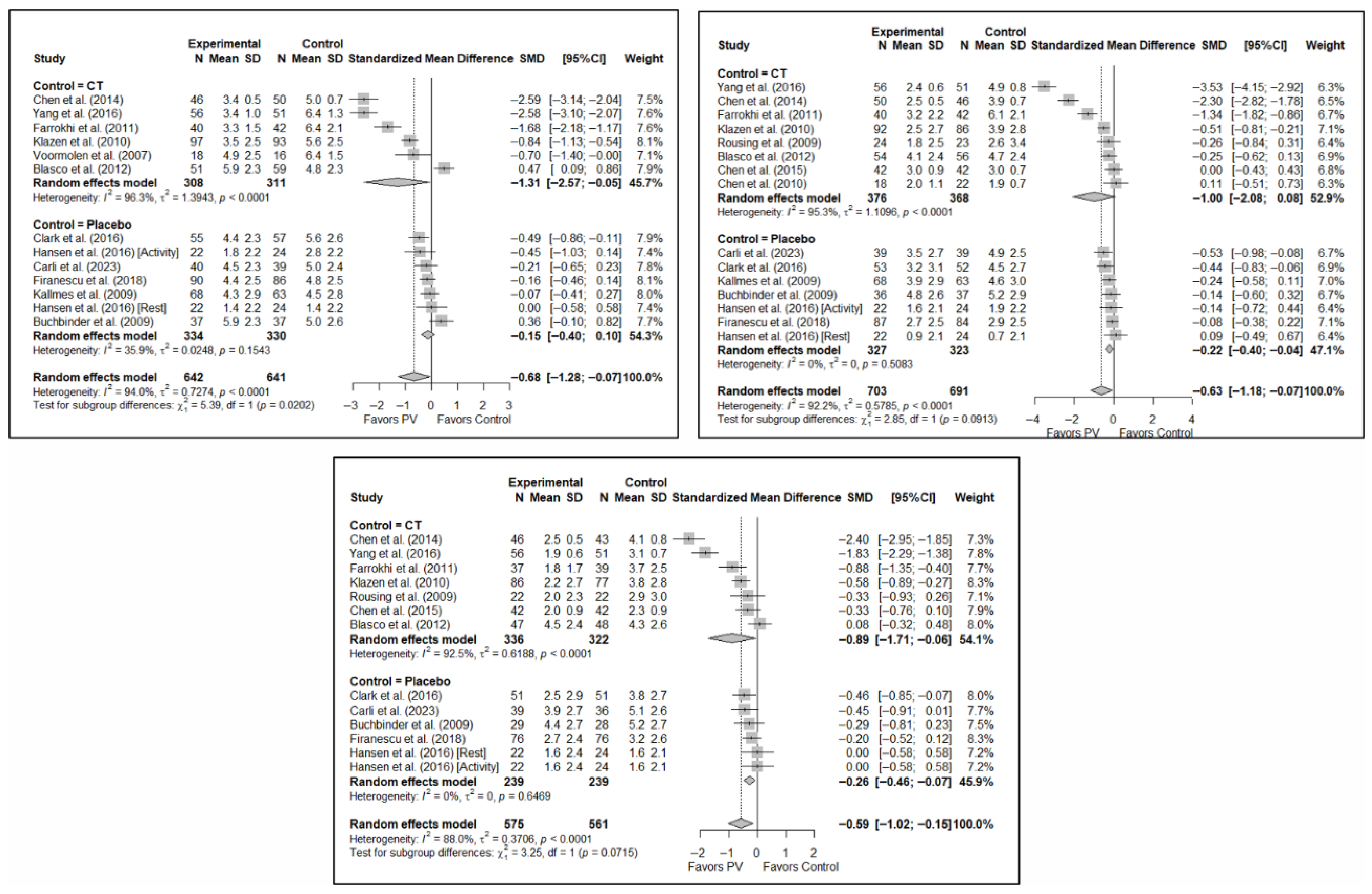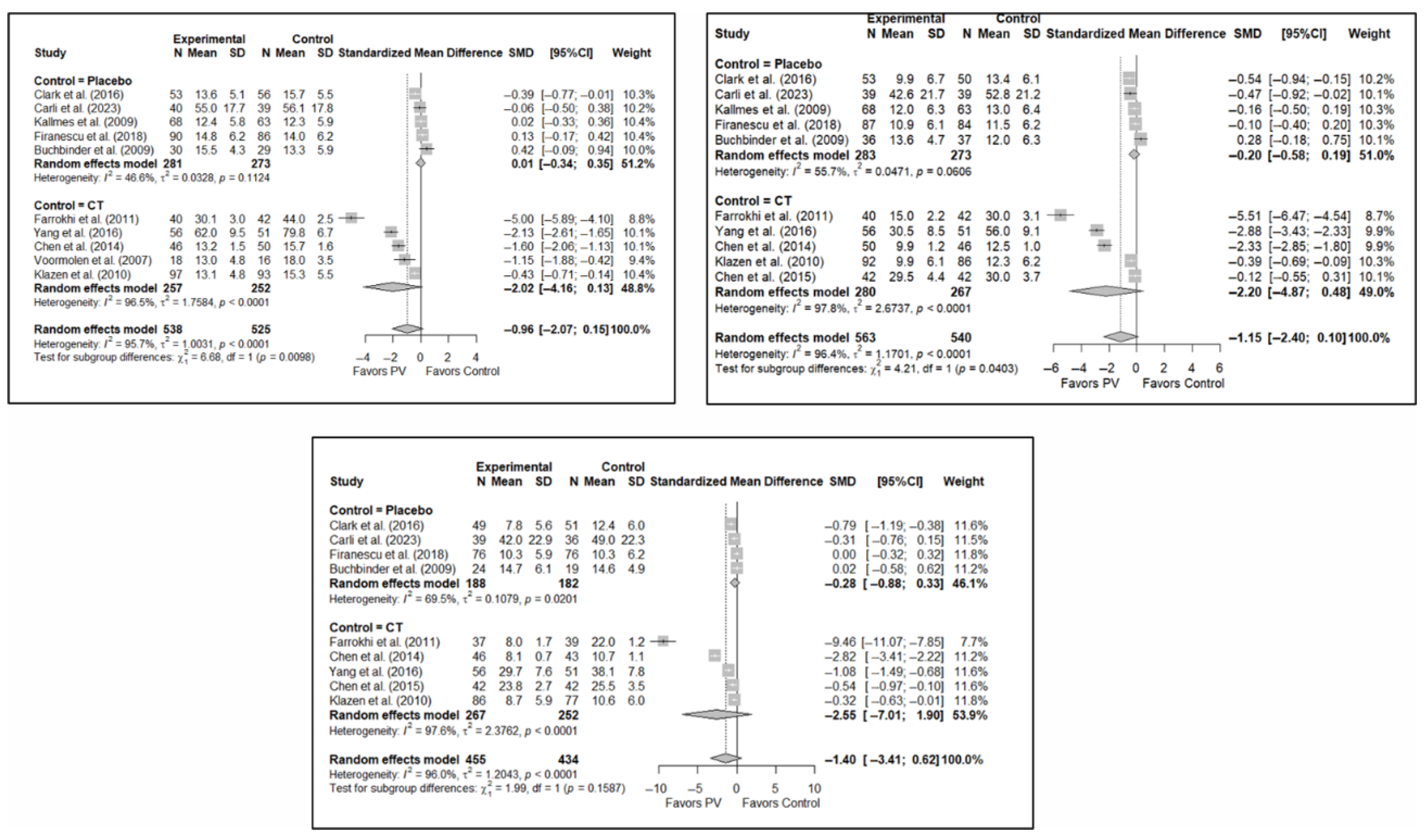 | Chen et al. (2014) [50] | PV | 46 | 64.6 (9.1) | 14/32 | 7.1 (3) | 12 | 6.5 (0.9) | 18.6 (1.8) | 59.9 (2.2) | - |