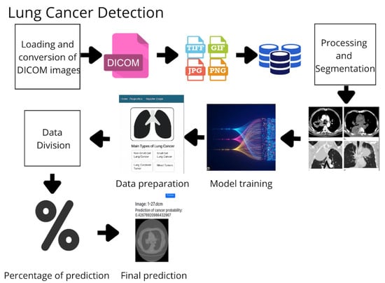 Background/Objectives: Lung cancer remains the leading cause of cancer-related mortality worldwide among both men and women. Early and accurate detection is essential to improve patient outcomes. This study explores the use of artificial intelligence (AI)-based software for the diagnosis of lung cancer through the analysis of medical images in DICOM format, aiming to enhance image visualization, preprocessing, and diagnostic precision in chest computed tomography (CT) scans. Methods: The proposed system processes DICOM medical images converted to standard formats (JPG or PNG) for preprocessing and analysis. An ensemble of classical machine learning algorithms—including Random Forest, Gradient Boosting, Support Vector Machine, and K-Nearest Neighbors—was implemented to classify pulmonary images and predict the likelihood of malignancy. Image normalization, denoising, segmentation, and feature extraction were performed to improve model reliability and reproducibility. Results: The AI-enhanced system demonstrated substantial improvements in diagnostic accuracy and robustness compared with individual classifiers. The ensemble model achieved a classification accuracy exceeding 90%, highlighting its effectiveness in identifying malignant and non-malignant lung nodules. Conclusions: The findings indicate that AI-assisted CT image processing can significantly contribute to the early detection of lung cancer. The proposed methodology enhances diagnostic confidence, supports clinical decision-making, and represents a viable step toward integrating AI into radiological workflows for early cancer screening.