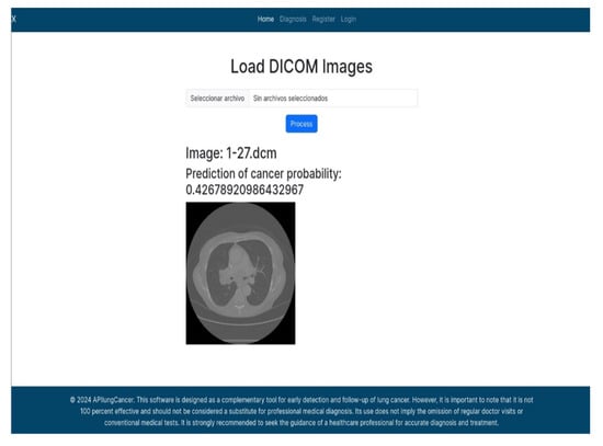 In this example (Figure 5), the DICOM image 1-27.dcm from the test set was processed and the software calculated a cancer probability of 0.4267 (42.67%), indicating a high likelihood of malignancy.