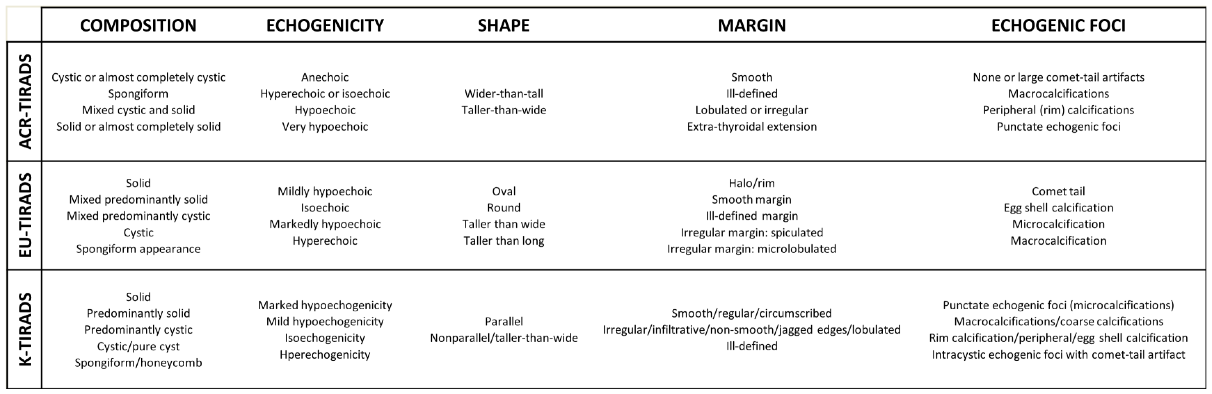 | ACR-TIRADS Lexicon | EU-TIRADS Lexicon | K-TIRADS Lexicon | |