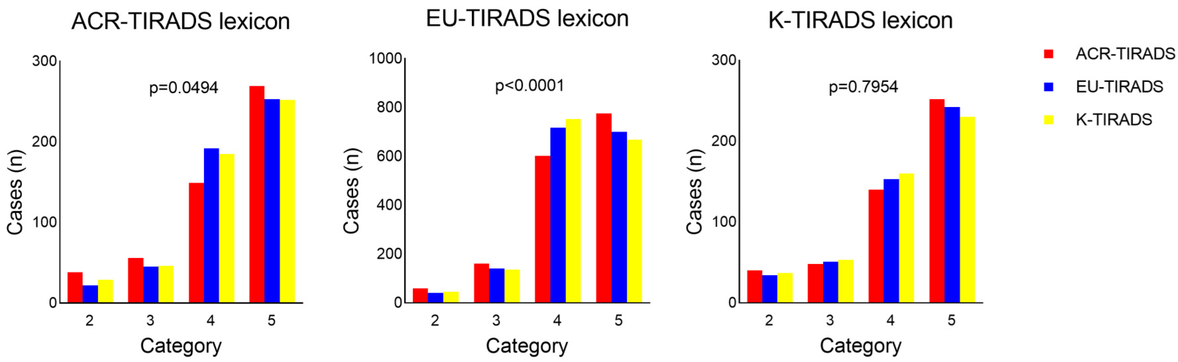- Piticchio, T.; Russ, G.; Radzina, M.; Frasca, F.; Durante, C.; Trimboli, P. Head-to-head comparison of American, European, and Asian TIRADSs in thyroid nodule assessment: Systematic review and meta-analysis. Eur. Thyroid. J. 2024, 13, e230242. [Google Scholar] [CrossRef]