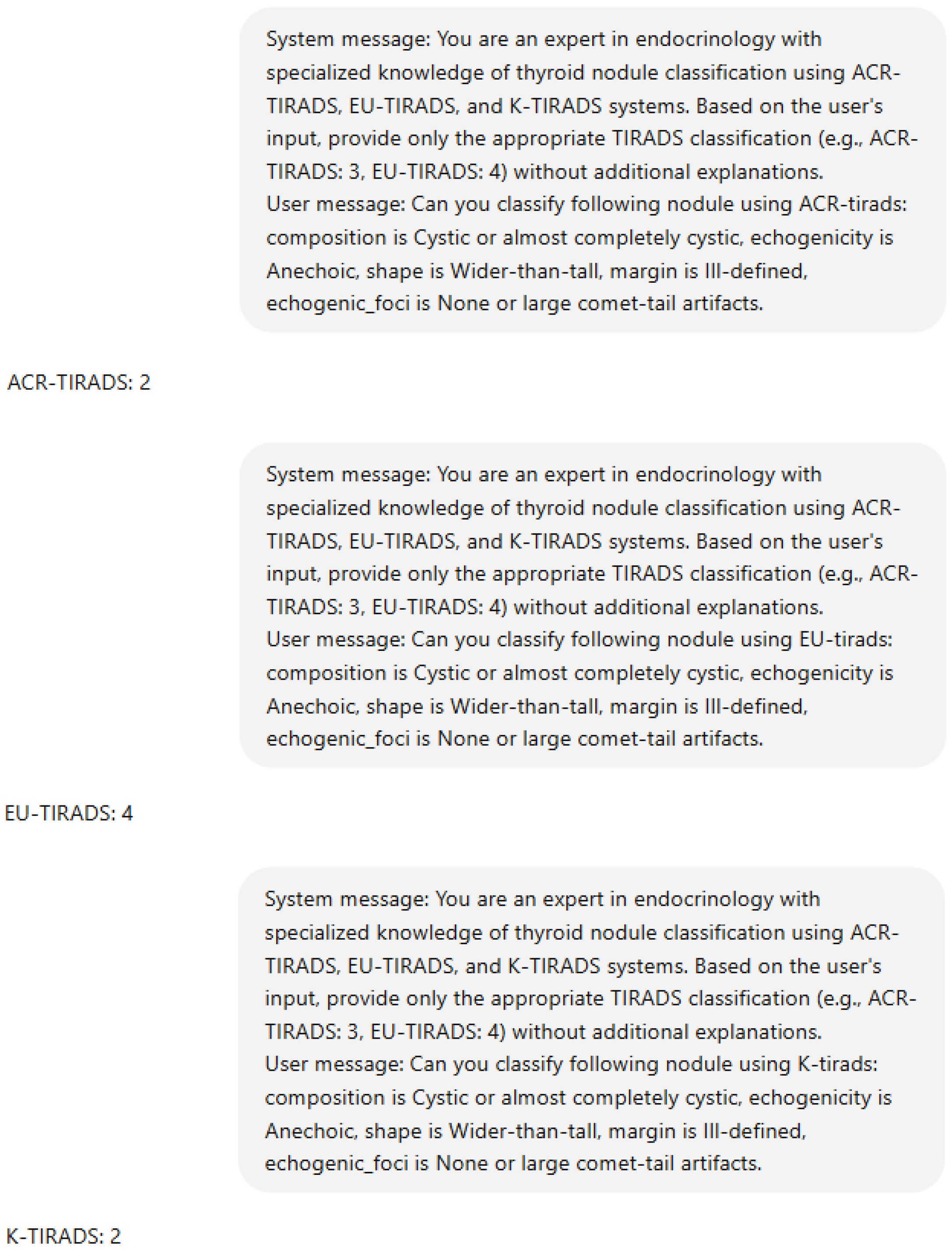 Chicago/Turabian StyleTrimboli, Pierpaolo, Amos Colombo, Lorenzo Ruinelli, and Andrea Leoncini. 2025. "Variability of ChatGPT in Interpreting the Lexicon of ACR-TIRADS, EU-TIRADS, and K-TIRADS" Diagnostics 15, no. 21: 2694. https://doi.org/10.3390/diagnostics15212694