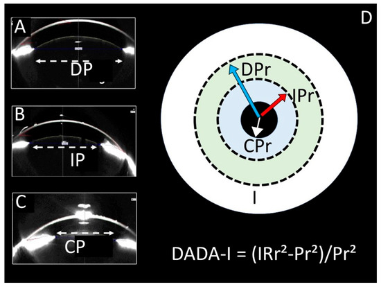 Pupil Measurements and DADA Index Schematic: (A) Optical Coherence Tomography (OCT) measurement of a dilated pupil (DP). (B) OCT measurement of an isocoric pupil (IP). (C) OCT measurement of a contracted pupil (CP). (D) Schematic diagram illustrating the components of the DADA Index (DADA-I) calculation, defined as the ratio of the iris surface area (IRr2) to the pupil surface area (Pr2). The diagram shows the radii for a dilated (DPr), isocoric (IPr), and contracted (CPr) pupil relative to the total iris (I). The formula is: DADA-I = (IRr2 − Pr2)/Pr2.