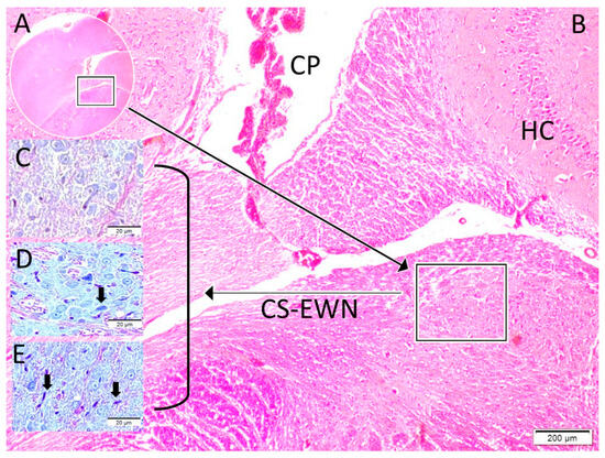 Histological Localization and Degeneration in Edinger–Westphal Nucleus. (A,B): Placement of superior colliculus in mesencephalic tegmentum adjacent to hippocampus (HC, boxed). (B): Magnified localization of Edinger–Westphal nucleus (CS-EWN) in superior colliculus (CS), neighbouring ventricles, choroid plexuses (CP), and hippocampus (HC). (C–E): Normal (Control/(C)), mild (SHAM/(D)), and advanced degenerated neurons (black arrows, Study/(E)) in Edinger–Westphal nucleus. Criteria for neuronal degeneration: cellular angulation, nuclear shrinkage, cytoplasmic condensation, and darkening (LM, H&E; ×10 for (D), ×40 for (A–C); scale bars as indicated).