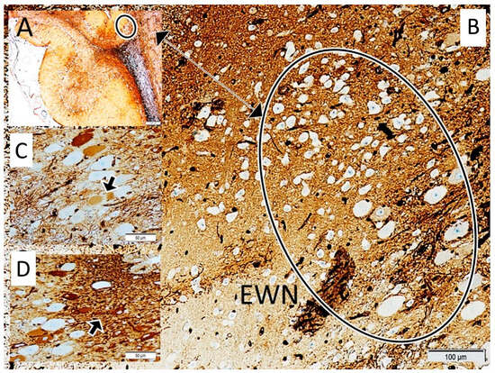 Anatomical Localization of the Superior Colliculus and Edinger–Westphal Nucleus with Neuronal Degeneration Analysis. The image shows the anatomical location of the superior colliculus (within the circle/(A)) in the mesencephalic tegmentum of a normal specimen (A). The localization of the Edinger–Westphal nucleus (EWN) within the superior colliculus is also depicted. Normal (Control/(B)), mildly degenerated (SHAM/(C)), and severely degenerated neurons (indicated by black arrows) are observed in the Edinger–Westphal nucleus across normal (B), sham (C), and study group subjects (D). Criteria for neuronal degeneration generally include cellular/neuronal angulation, nuclear shrinkage, cytoplasmic condensation, and cellular darkening (LM, GFAP, ×10/(D) ×40/(C,D)).
