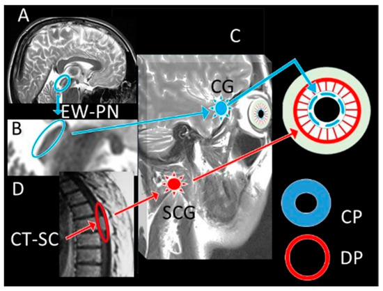 Table of Pathogenesis: Pathogenesis Table: Human brain MRI; the location of the Edinger Westphal and Perlia nuclei (EW-P) located in the tegmentum mesencephali in the superior colliculus (A,B), their connection with the ciliary ganglion network (CG) and pupillary muscles (Blue arrows), the location of the parasympathetic pupilloconstrictor fibres and muscles affecting the pupilloconstrictor muscles that innervate the pupillae (Blue/(A,B)) (C); the postganglionic fibres going to the pupillodilator muscles (Red arrow/(B)) of the sympathetic cervical ganglion network (SCG) originating from the cervicothoracic sympathetic centre (CT-SC) and coming to the superior cervical sympathetic ganglion (SCG), and the pupillodilator muscles they affect are observed (D). While the pupils contract with the parasympathetic effect (CP), they dilate with the sympathetic effect (DP). Representative constricted pupil (Blue Ring) and dilated pupil (Red Ring) are seen.