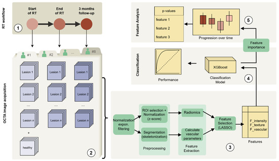 A schematic representation of the data analysis pipeline: (1) Radiotherapy regimen and timepoints, (2) OCTA image acquisition, (3) OCTA image processing and consecutive feature extraction and selection, (4) classification modelling based on XGBoost, (5) analysis of feature differences across the three timepoints (plus control) including the statistical testing.