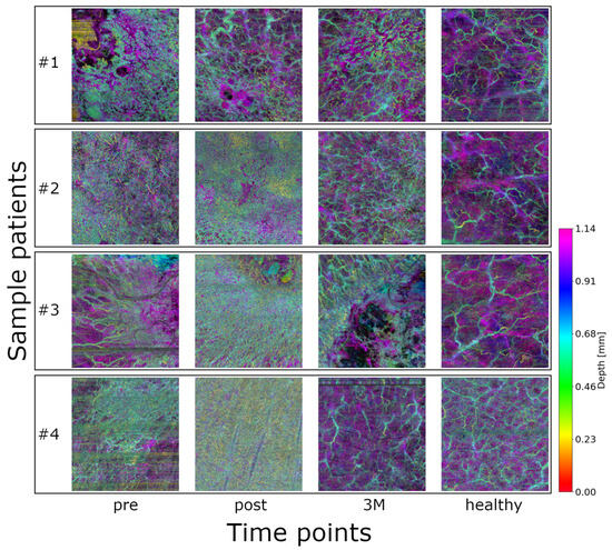 Each OCTA acquisition encompassed a larger volume, from which a subset of 120 × 512 × 512 pixels (corresponding to 1.15 × 10 × 10 mm3, accounting for a skin refractive index of 1.42) was selected. The first dimension represents the imaging depth, corresponding to a value in which vascular contrast is sufficient, and image quality is acceptable for analysis. The light source was calibrated at each use, and a B-scan preview was used as a fast quality check prior to each acquisition to reduce any variations in the OCTA system performance. Artifacts in the raw OCTA volumes were reduced using pixel intensity normalization and exponential filtering to correct motion-related and shadow artifacts. Additional preprocessing steps like 3D median filtering and contrast enhancement were employed to enhance the vasculature, and a depth color coding was used to enable intuitive depth interpretation in 2D OCTA projections. All preprocessing parameters, including the 3 × 3 × 3 3D median filter and contrast enhancement, were fixed across patients and timepoints to ensure reproducibility. Parameter sensitivity was not explored in this pilot dataset but will be systematically evaluated in follow-up work.
