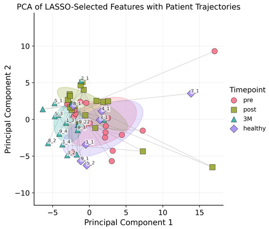 To visualize the temporal structure, the selected features were projected onto the first two principal components (PCA). For each cohort—pre-RT, immediate post-RT, 3-month follow-up, and healthy—we plotted the centroid and its 1-standard-deviation ellipse. The ellipse is defined by the eigen-decomposition of the 2 × 2 covariance matrix . Its width and height are and ; the tilt angle comes from . More details on this procedure and the LASSO regression can be found in Appendix C.