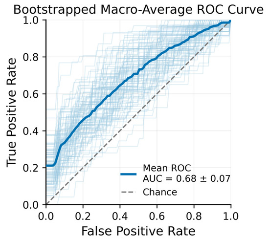An XGBoost classifier was subsequently trained to distinguish OCTA images acquired at the three time points (pre-irradiation, post-radiotherapy, and three months post-treatment). Figure 4 presents the macro-averaged receiver operating characteristic (ROC) curves for this three-class problem. The mean ROC Area Under the Curve (AUC) across bootstrap samples was 0.68 ± 0.07, indicating moderate discriminative performance. XGBoost feature importance analysis identified several top predictors that contributed most strongly to distinguishing the time points.