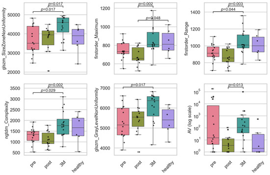 Boxplots of the significant intensity and texture radiomic, and the vascular features. Plotted are the features for the timepoints before RT (‘pre’), directly after RT (‘post’), 3 months after RT (‘3M’) and a healthy skin sample as baseline. Statistically significant pairwise contrasts were annotated with p-values (Dunn’s) if the feature was expressing a significant difference (p < 0.05) based on the Benjamini–Hochberg adjusted p-value of the Kruskal–Wallis test. Boxplots of all 20 important features can be found in Appendix D. The features were size zone non-uniformity (glszm_SizeZoneNonUniformity), maximum intensity (firstorder_Maximum), intensity range (firstorder_Range), complexity (ngtdm_Complexity), gray level non-uniformity (glszm_GrayLevelNonUniformity) and avascular area (AV).