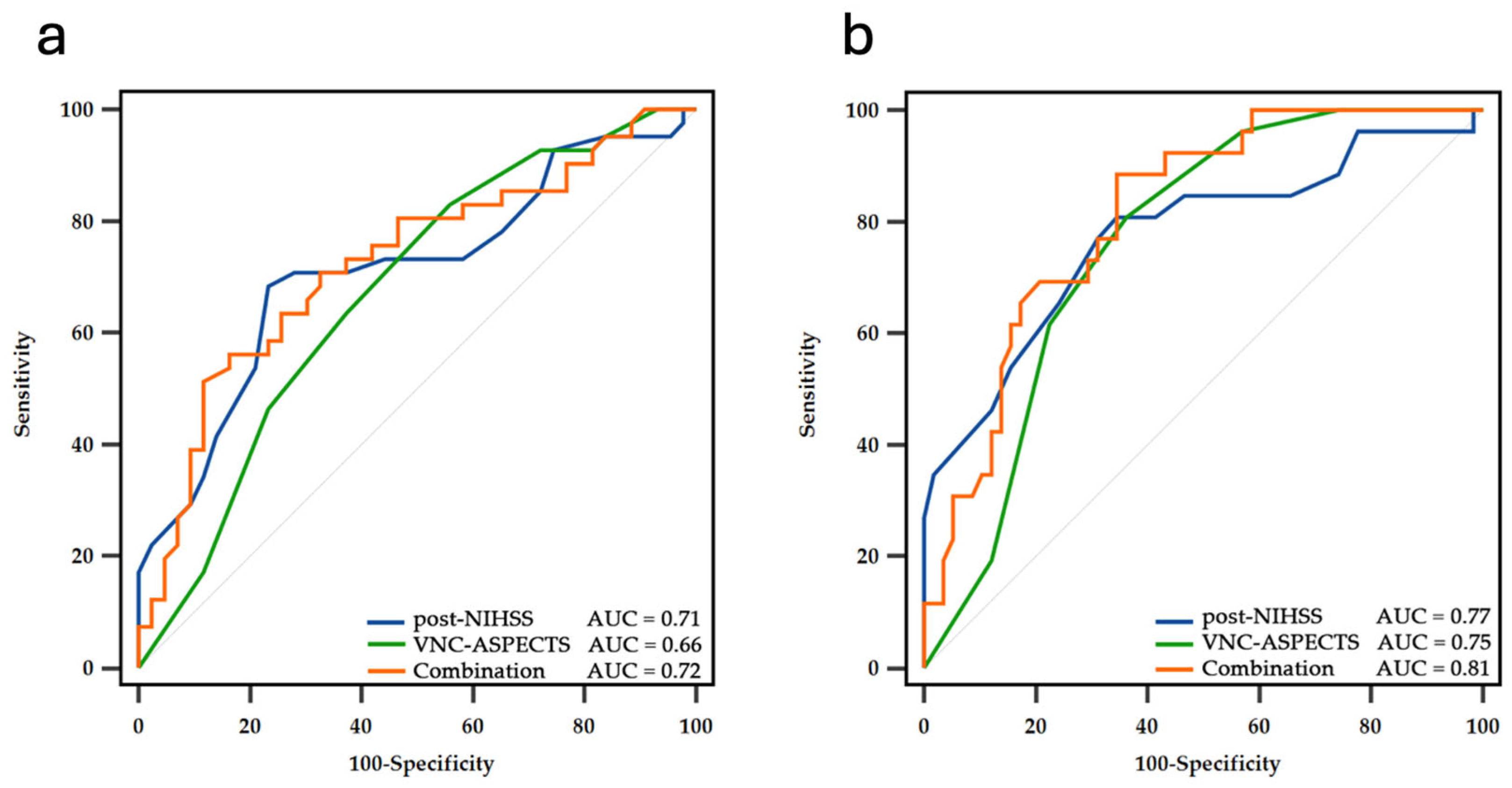 | Post-24 h NIHSS | 0.84 | (0.76–0.93) | 0.001 ** | 0.89 | (0.80–0.99) | 0.027 * |