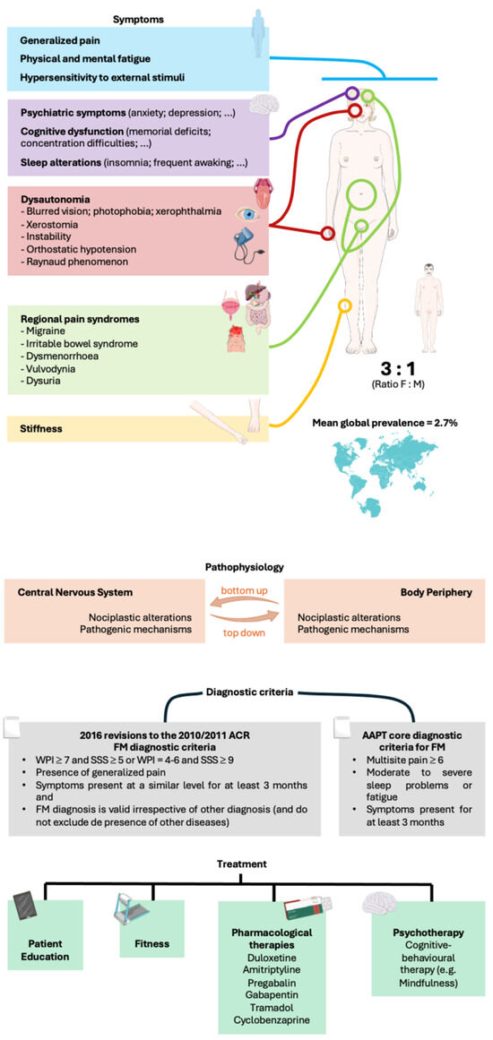 The burden of fibromyalgia extends beyond physical symptoms, significantly impacting daily functioning, psychosocial well-being, and health care utilization [8,9,10]. Patients experience comorbid conditions such as irritable bowel syndrome, temporomandibular disorders, and migraine, highlighting the systemic nature of fibromyalgia [11]. This complexity demands a comprehensive understanding of the underlying pathophysiology to guide diagnosis, prognosis, and personalized treatment strategies.